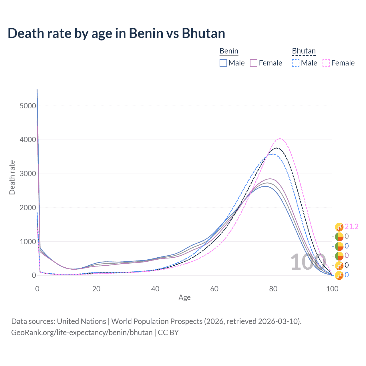 In Benin, the most common age of death is 0, compared to 81 in Bhutan. The median age of death is 70.1 in Benin and 77.6 in Bhutan, meaning only half of each cohort is expected to live past that age.