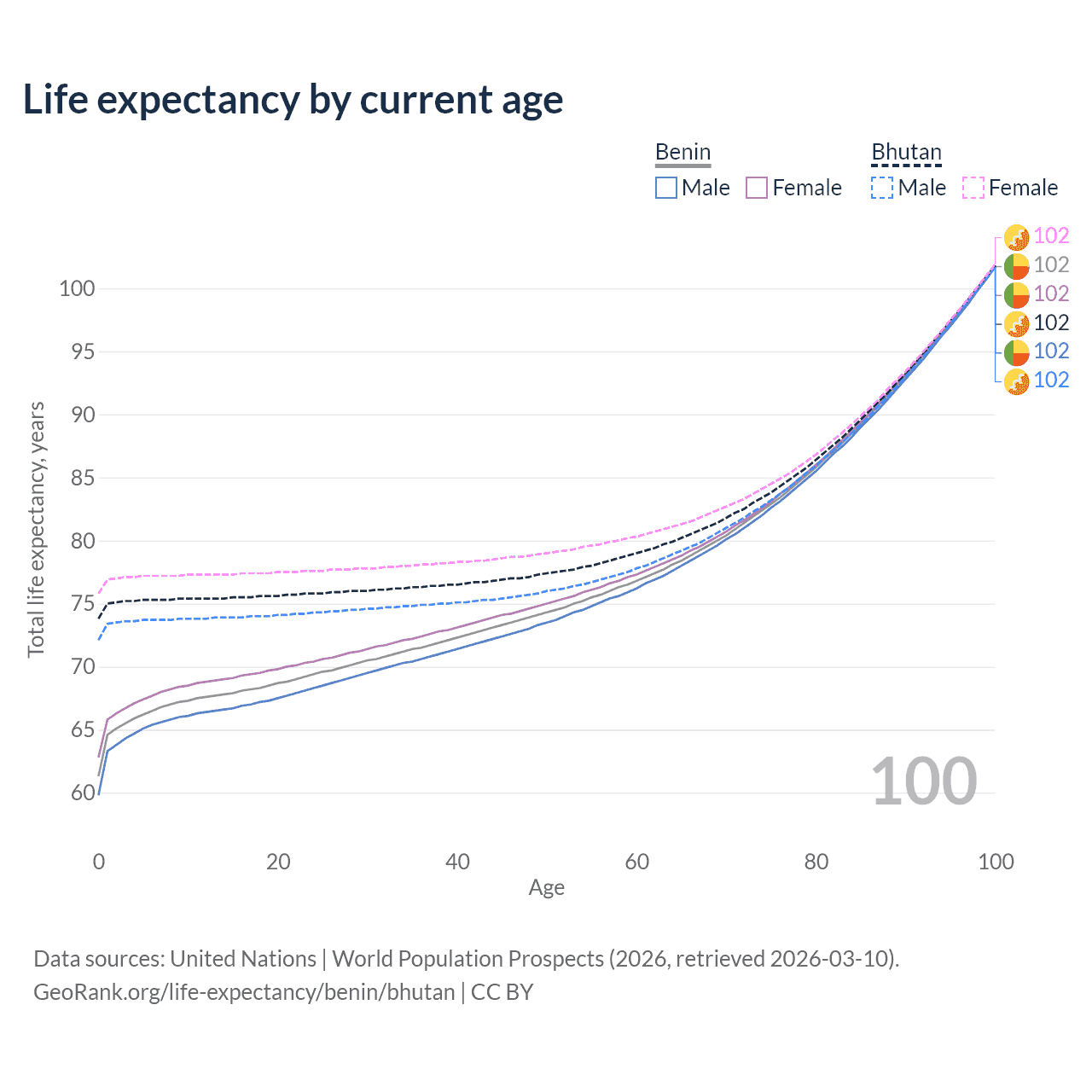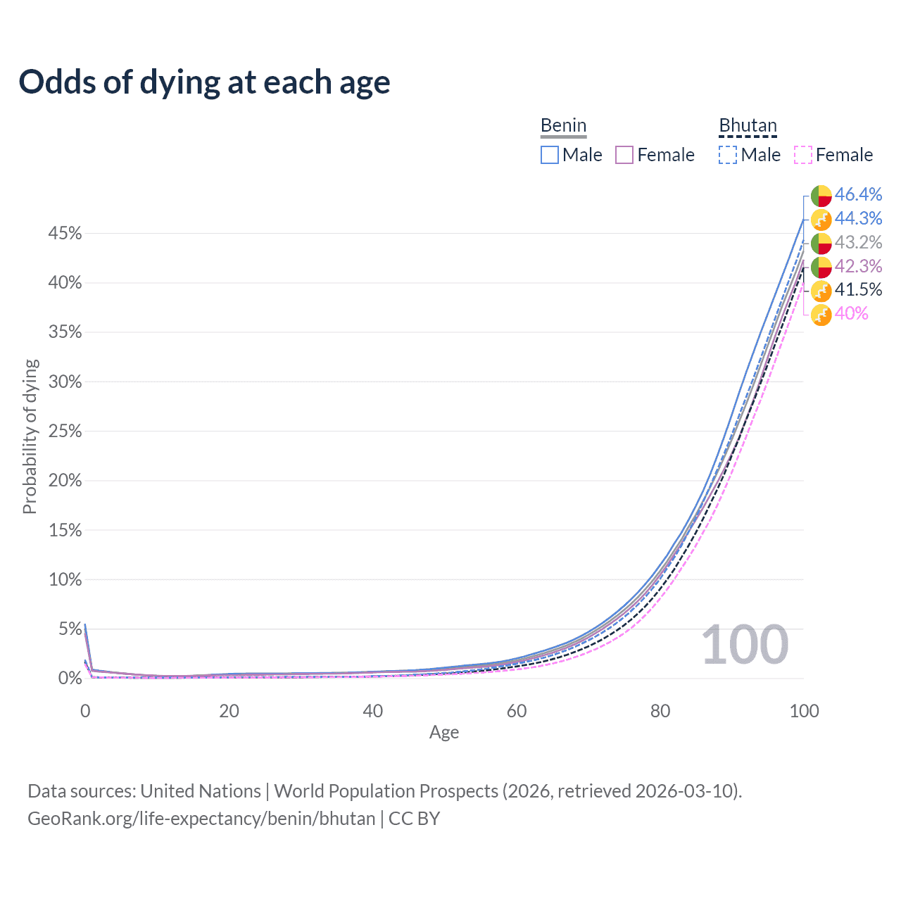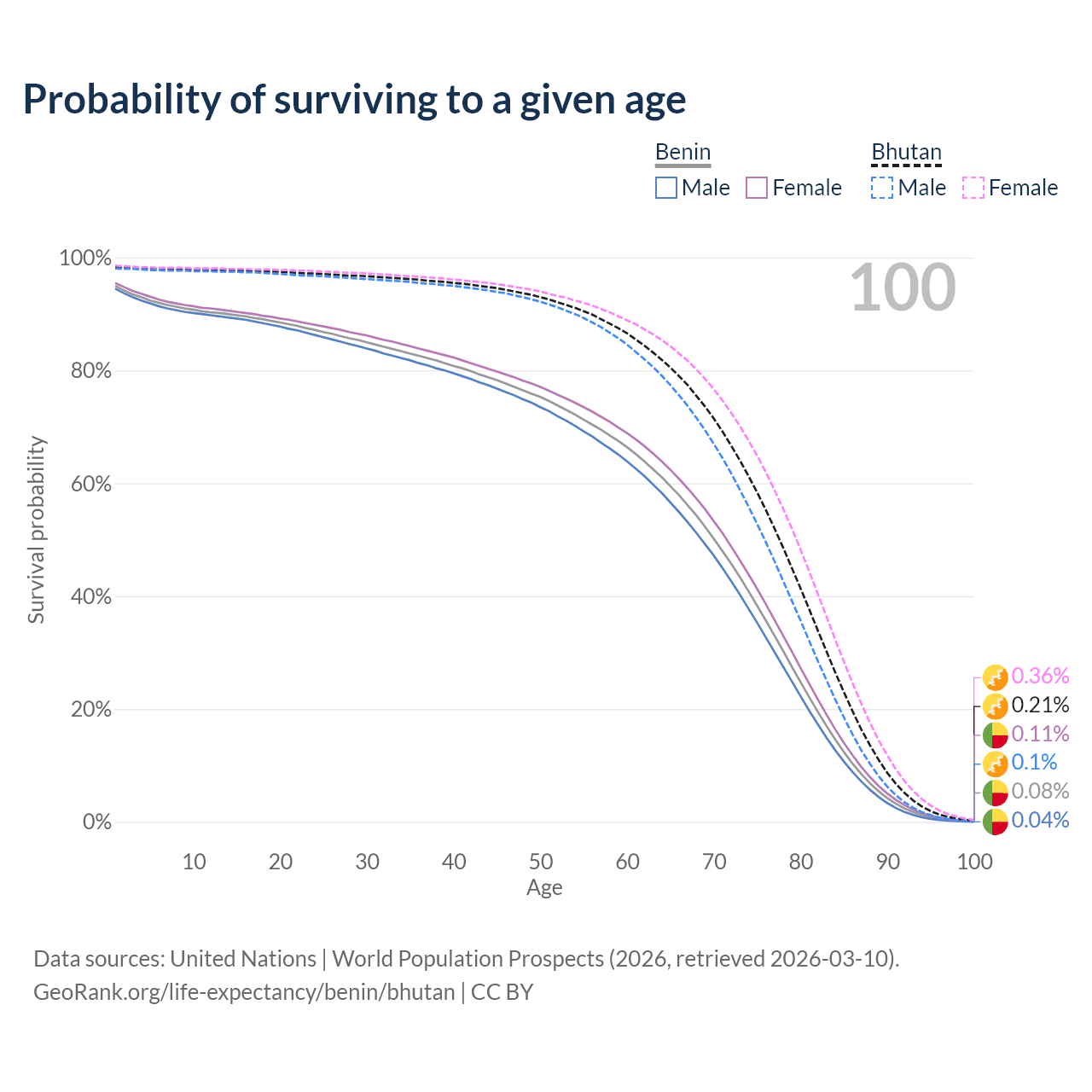 This life expectancy calculator shows the odds of living to 100, 95, 90, and below based on current age for both males and females in Benin and Bhutan, along with mean and median age of death. The calculations are based on the 2026 life tables (actuarial tables) from the UN World Population Prospects.