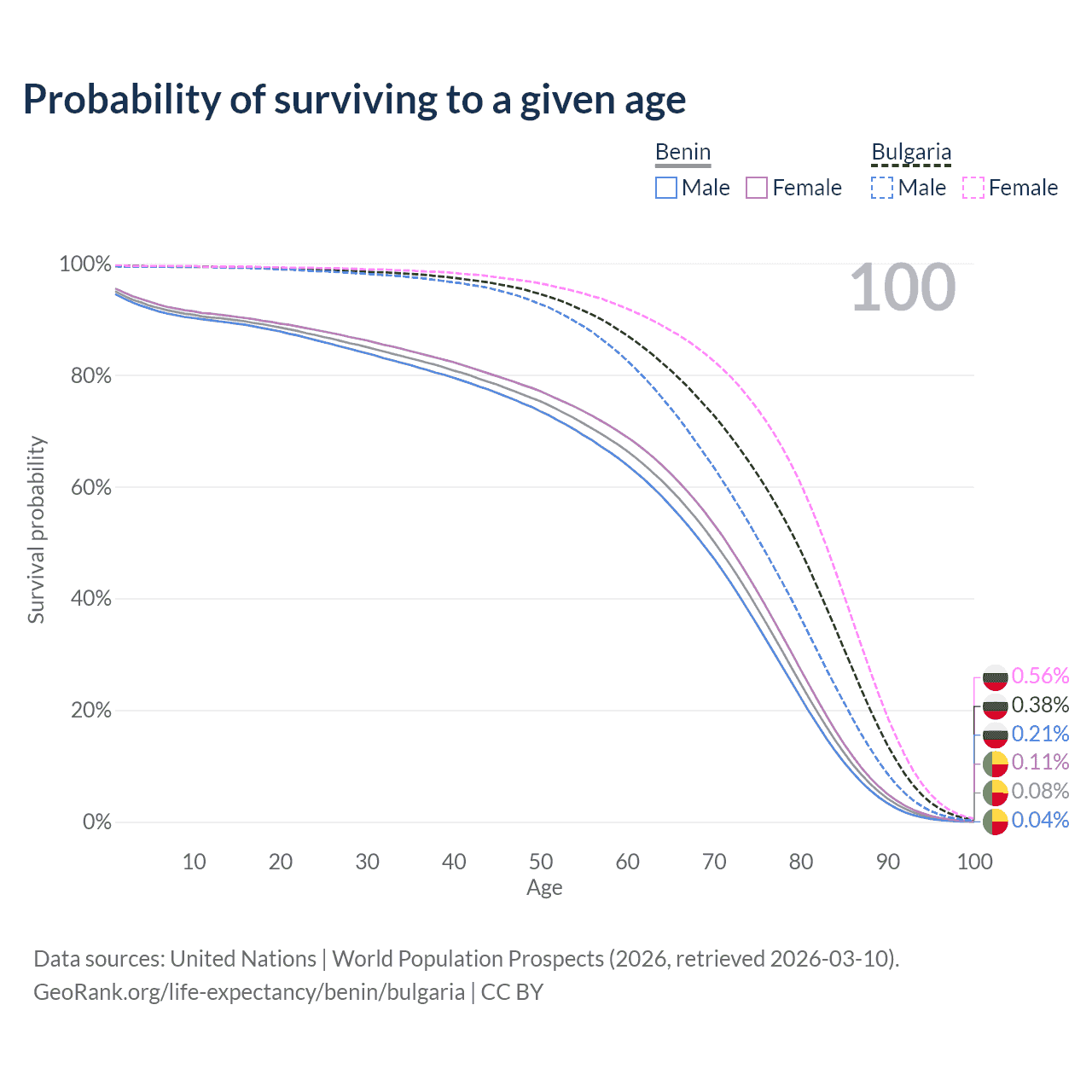 This life expectancy calculator shows the odds of living to 100, 95, 90, and below based on current age for both males and females in Benin and Bulgaria, along with mean and median age of death. The calculations are based on the 2026 life tables (actuarial tables) from the UN World Population Prospects.