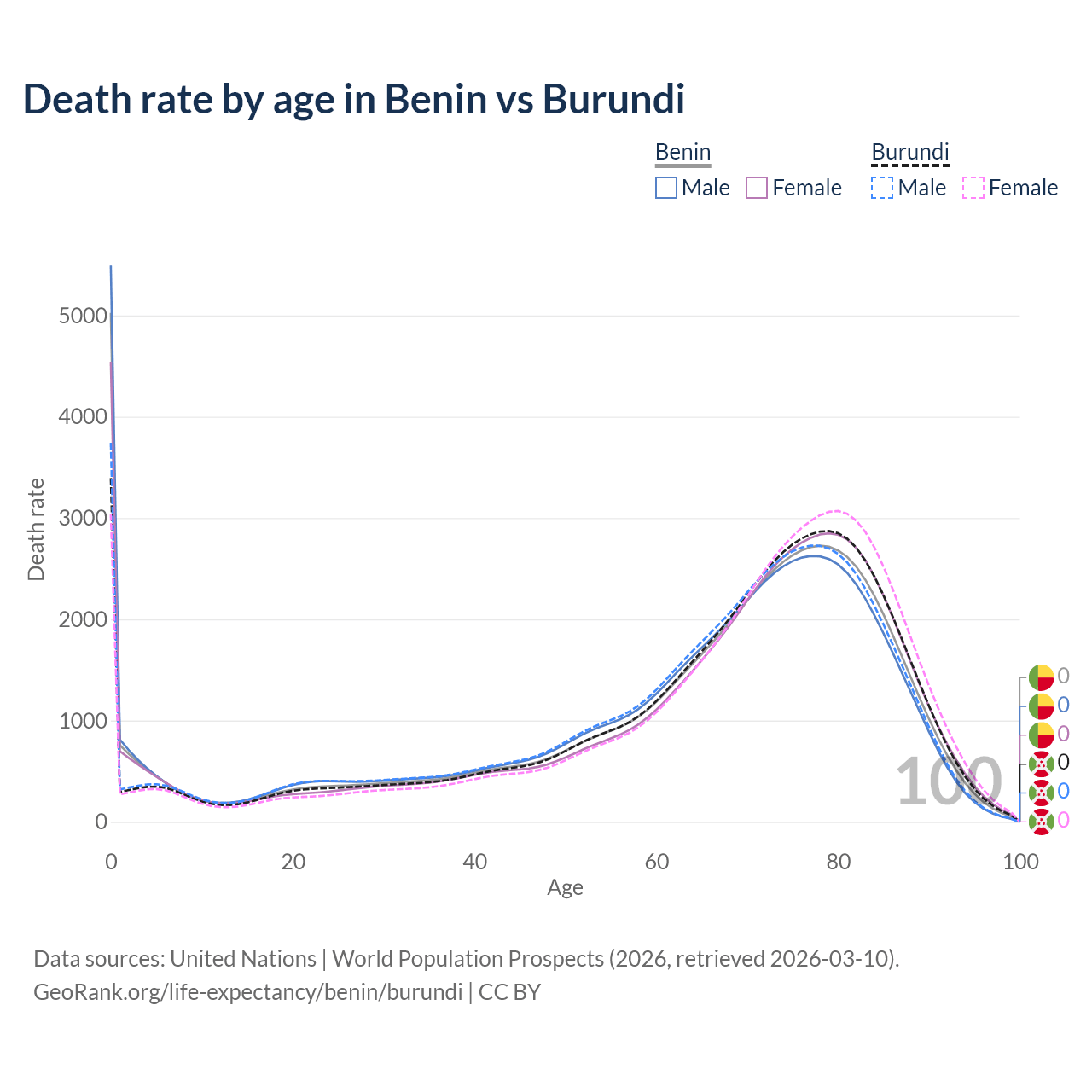 In Benin, the most common age of death is 0, compared to 0 in Burundi. The median age of death is 70.1 in Benin and 71.6 in Burundi, meaning only half of each cohort is expected to live past that age.