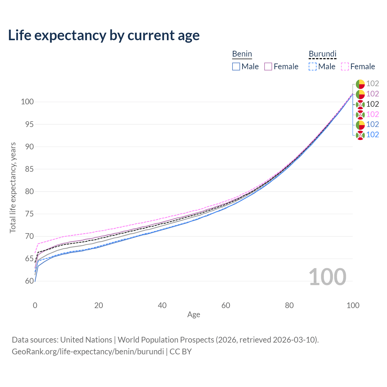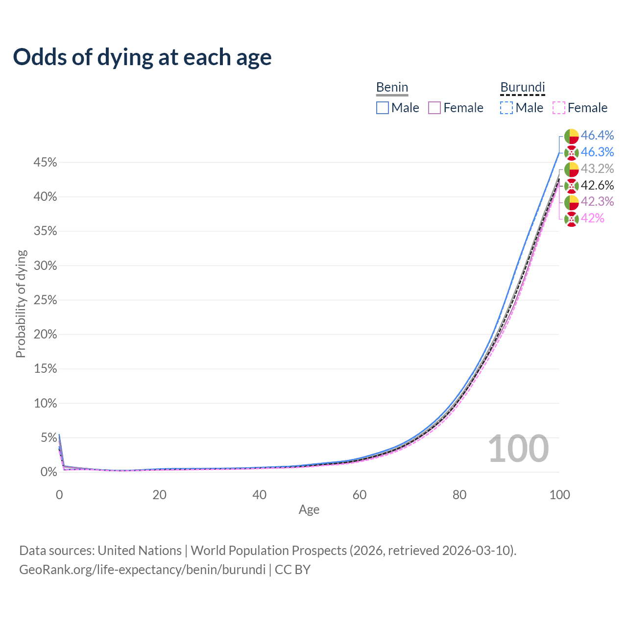 This life expectancy calculator shows the odds of living to 100, 95, 90, and below based on current age for both males and females in Benin and Burundi, along with mean and median age of death. The calculations are based on the 2026 life tables (actuarial tables) from the UN World Population Prospects.