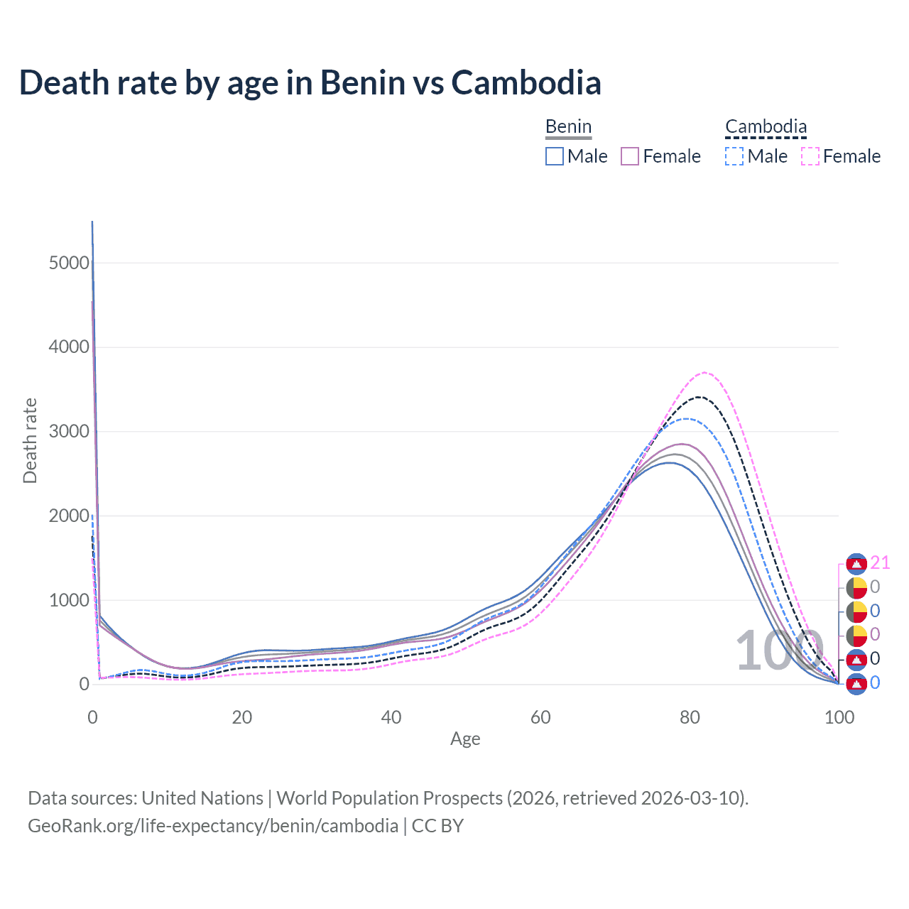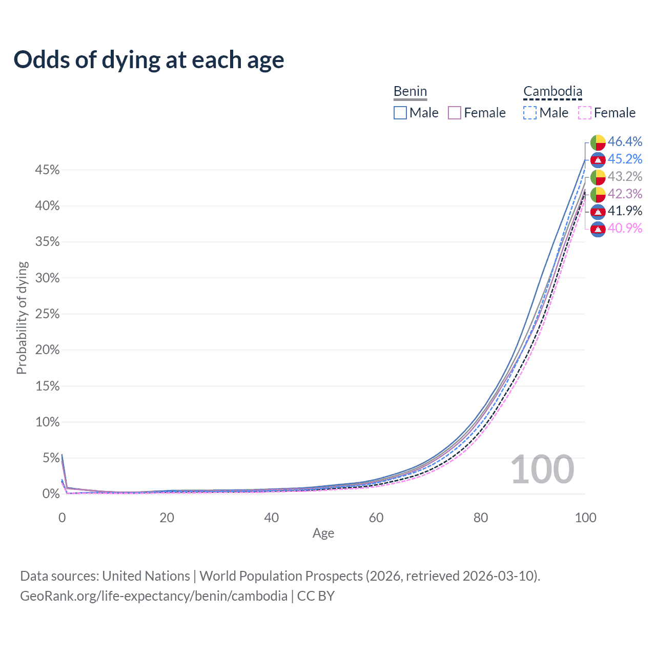 This life expectancy calculator shows the odds of living to 100, 95, 90, and below based on current age for both males and females in Benin and Cambodia, along with mean and median age of death. The calculations are based on the 2026 life tables (actuarial tables) from the UN World Population Prospects.