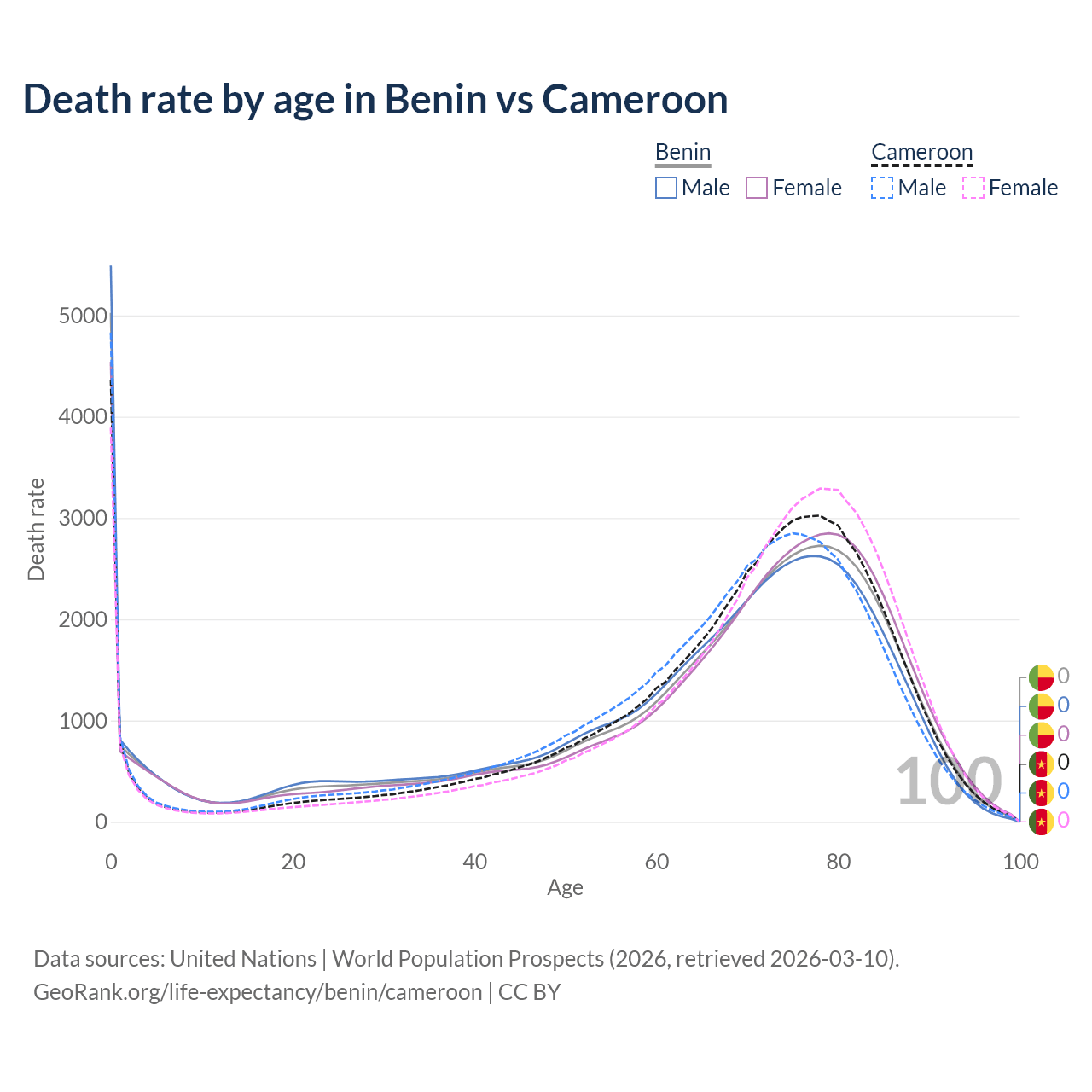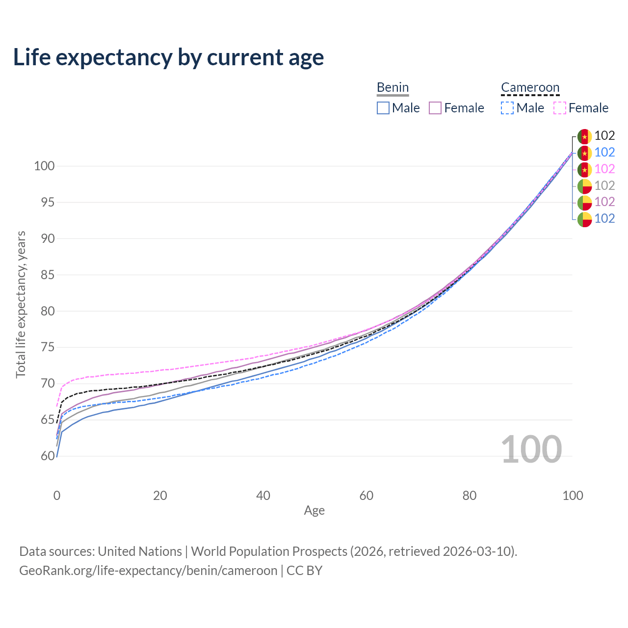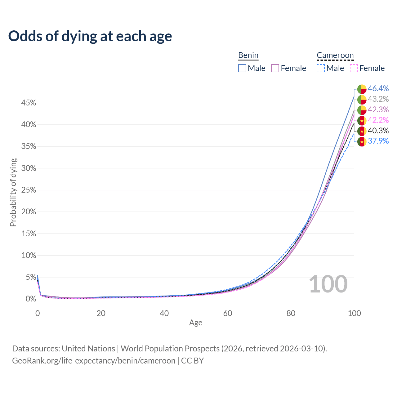 This life expectancy calculator shows the odds of living to 100, 95, 90, and below based on current age for both males and females in Benin and Cameroon, along with mean and median age of death. The calculations are based on the 2026 life tables (actuarial tables) from the UN World Population Prospects.