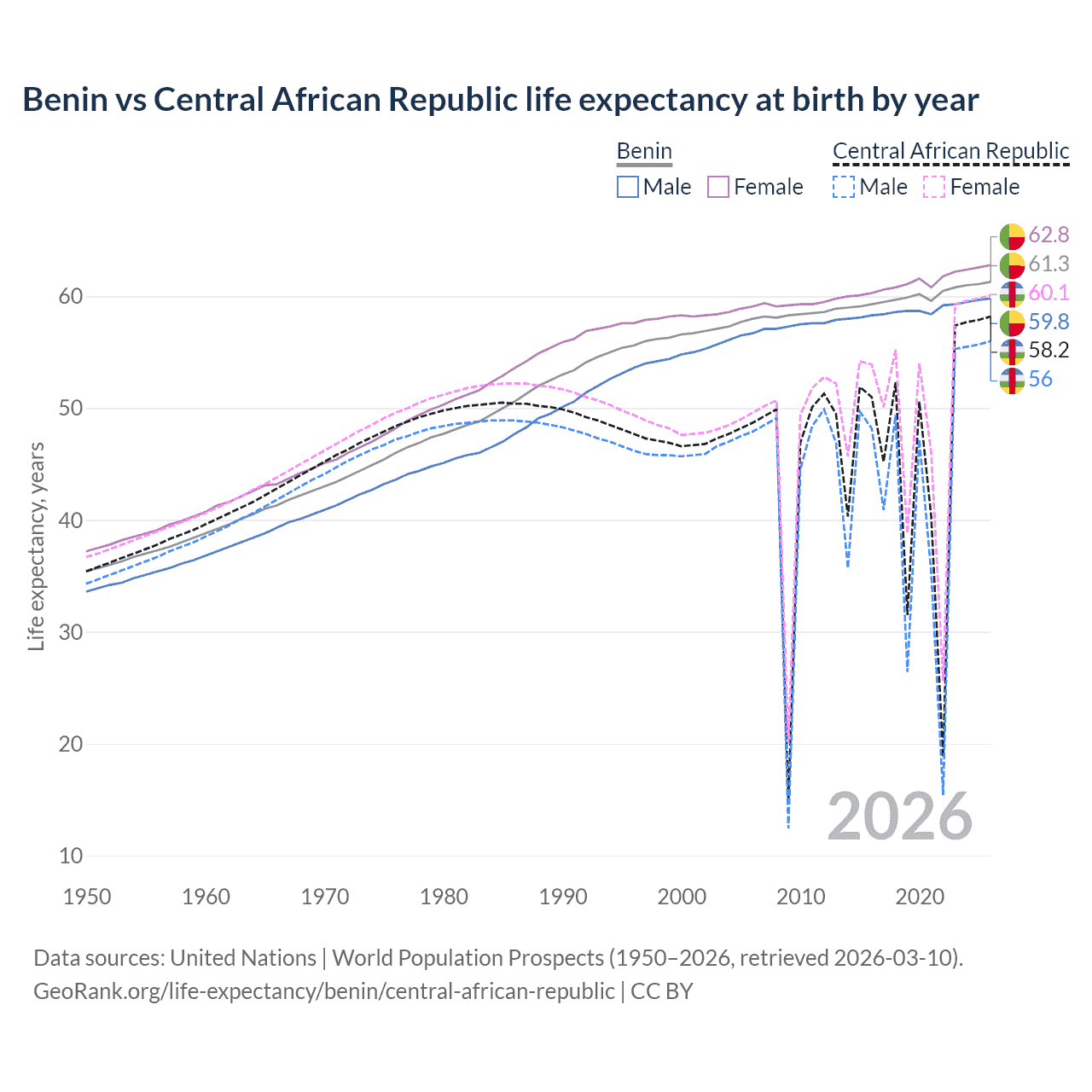 The average life expectancy at birth is 61.3 years in Benin vs 58.2 in the Central African Republic. Benin is ranked 189/197 by life expectancy, and the Central African Republic is 194/197. In Benin, the life expectancy is 59.8 years for males and 62.8 years for females. In the Central African Republic, it's 56 years for males and 60.1 years for females.