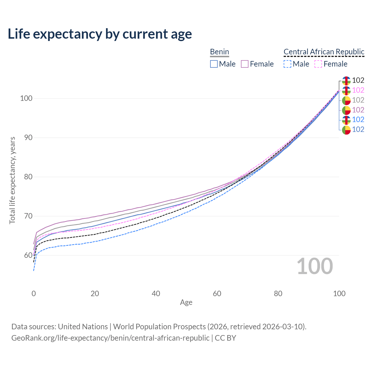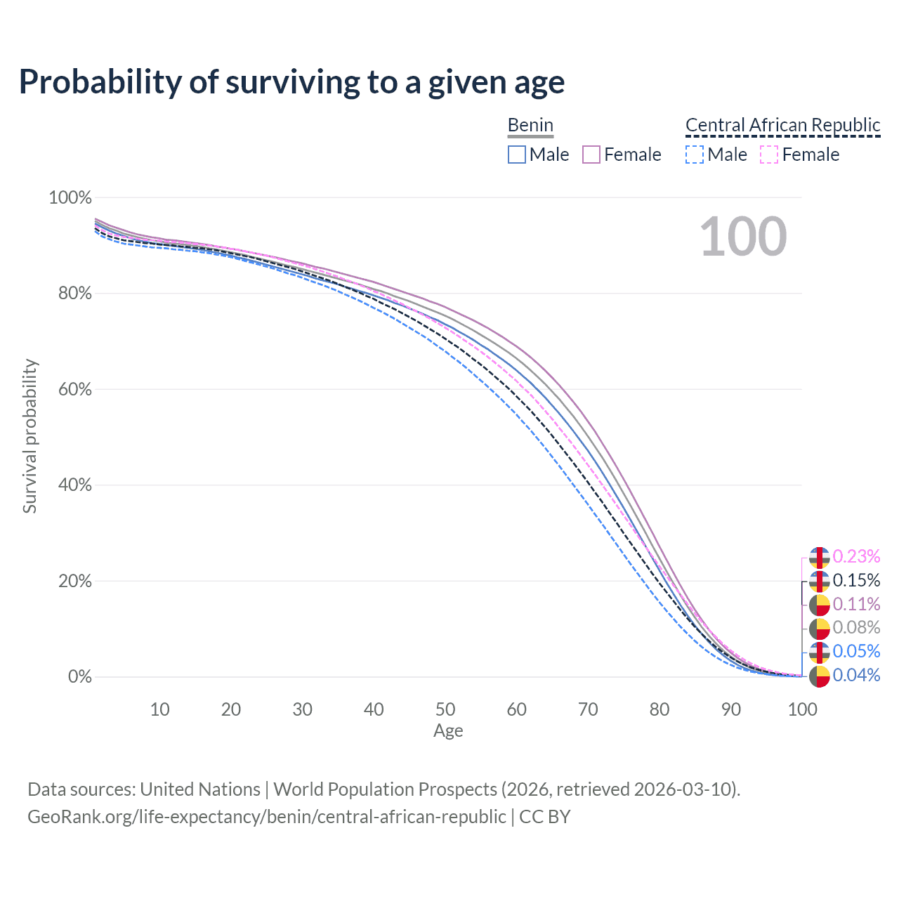 This life expectancy calculator shows the odds of living to 100, 95, 90, and below based on current age for both males and females in Benin and the Central African Republic, along with mean and median age of death. The calculations are based on the 2026 life tables (actuarial tables) from the UN World Population Prospects.