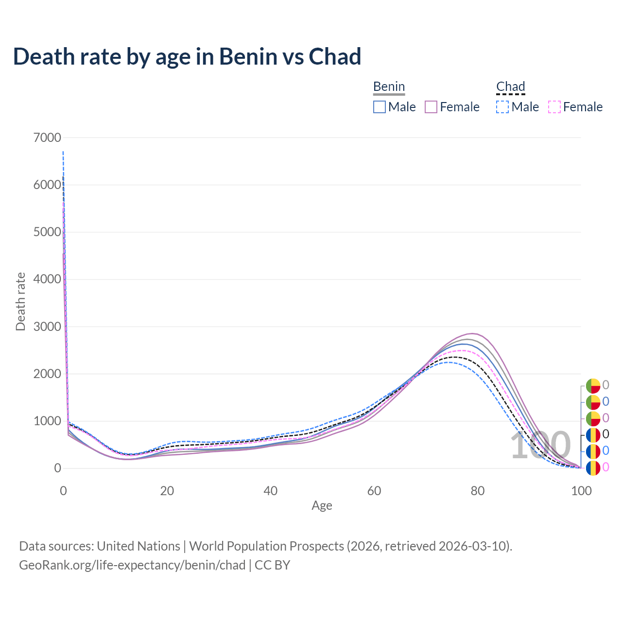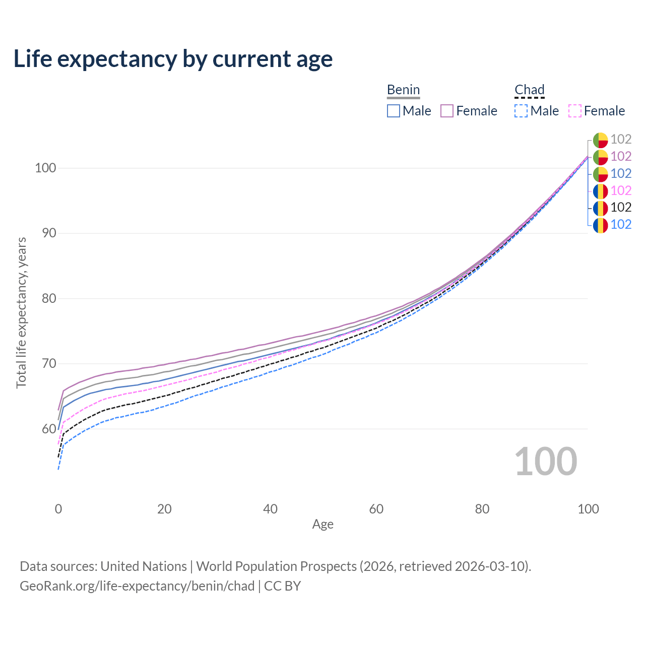 This life expectancy calculator shows the odds of living to 100, 95, 90, and below based on current age for both males and females in Benin and Chad, along with mean and median age of death. The calculations are based on the 2026 life tables (actuarial tables) from the UN World Population Prospects.