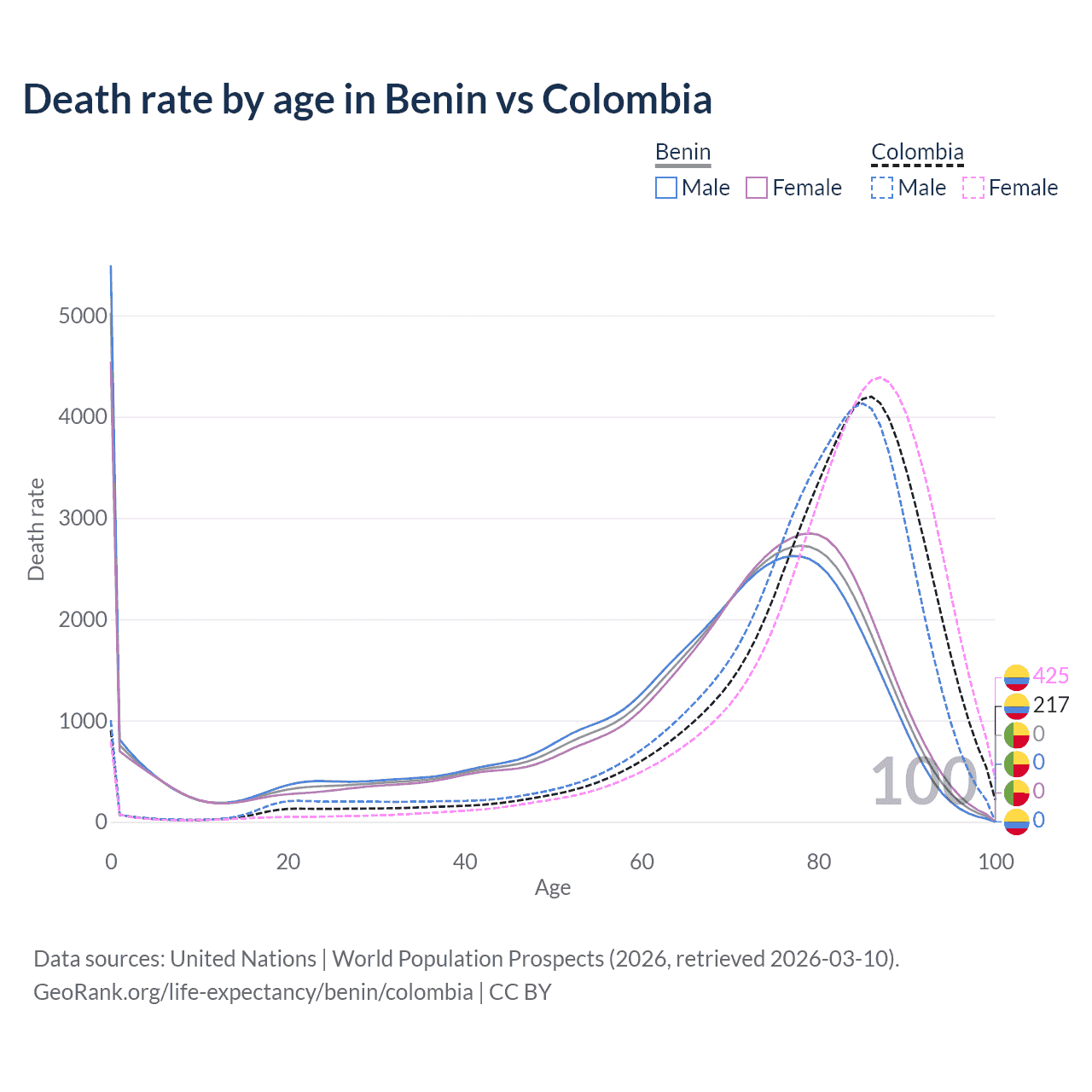 In Benin, the most common age of death is 0, compared to 86 in Colombia. The median age of death is 70.1 in Benin and 82.5 in Colombia, meaning only half of each cohort is expected to live past that age.