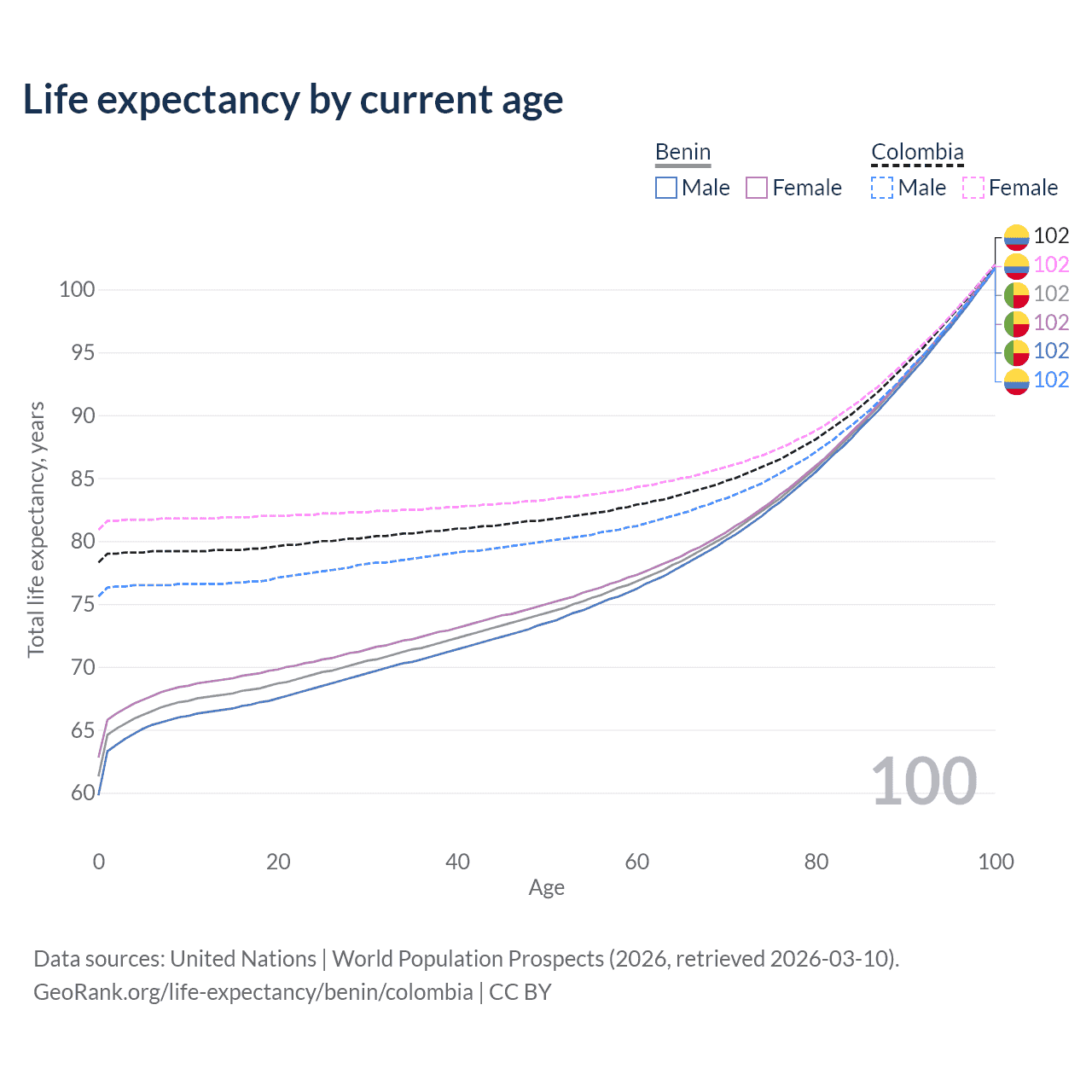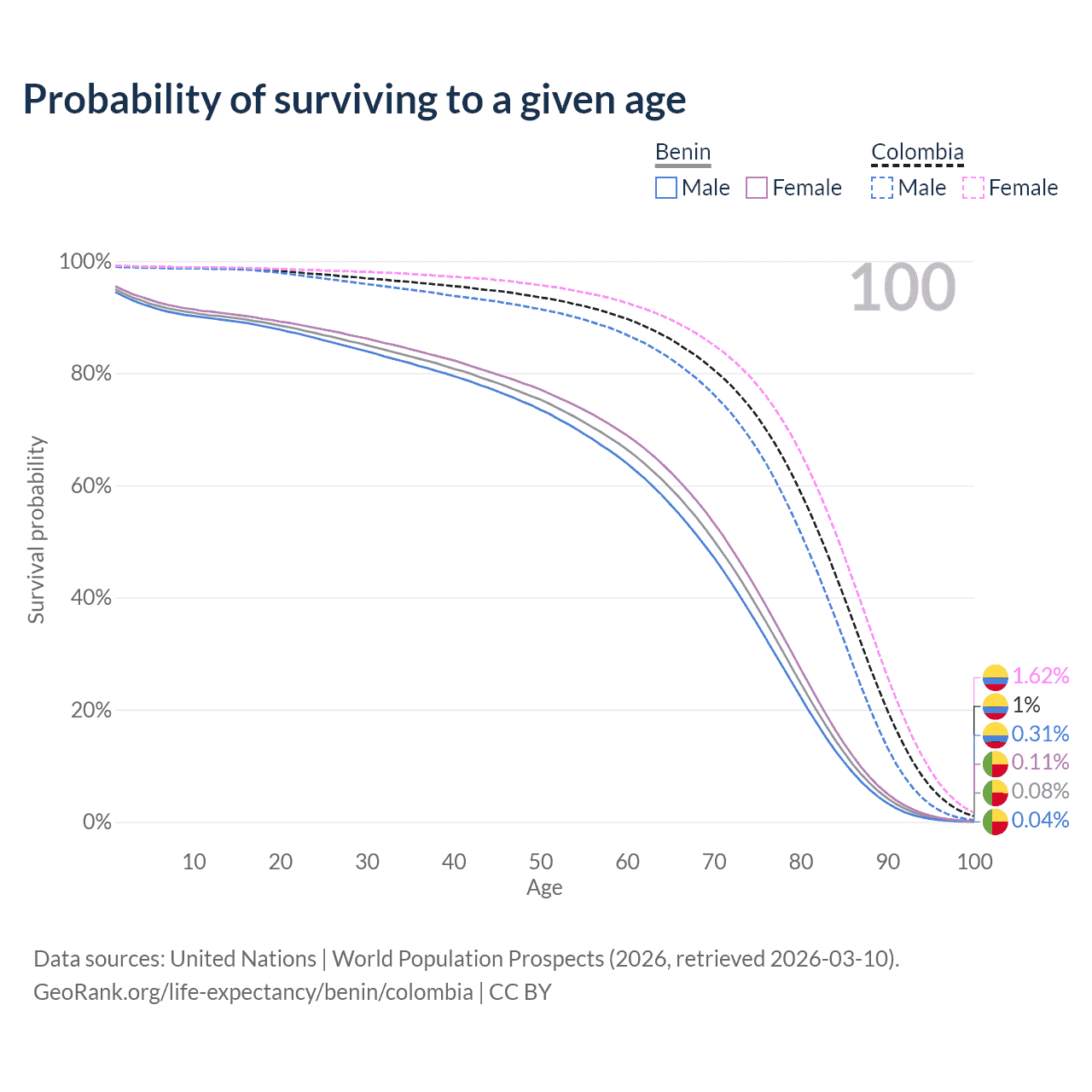This life expectancy calculator shows the odds of living to 100, 95, 90, and below based on current age for both males and females in Benin and Colombia, along with mean and median age of death. The calculations are based on the 2026 life tables (actuarial tables) from the UN World Population Prospects.