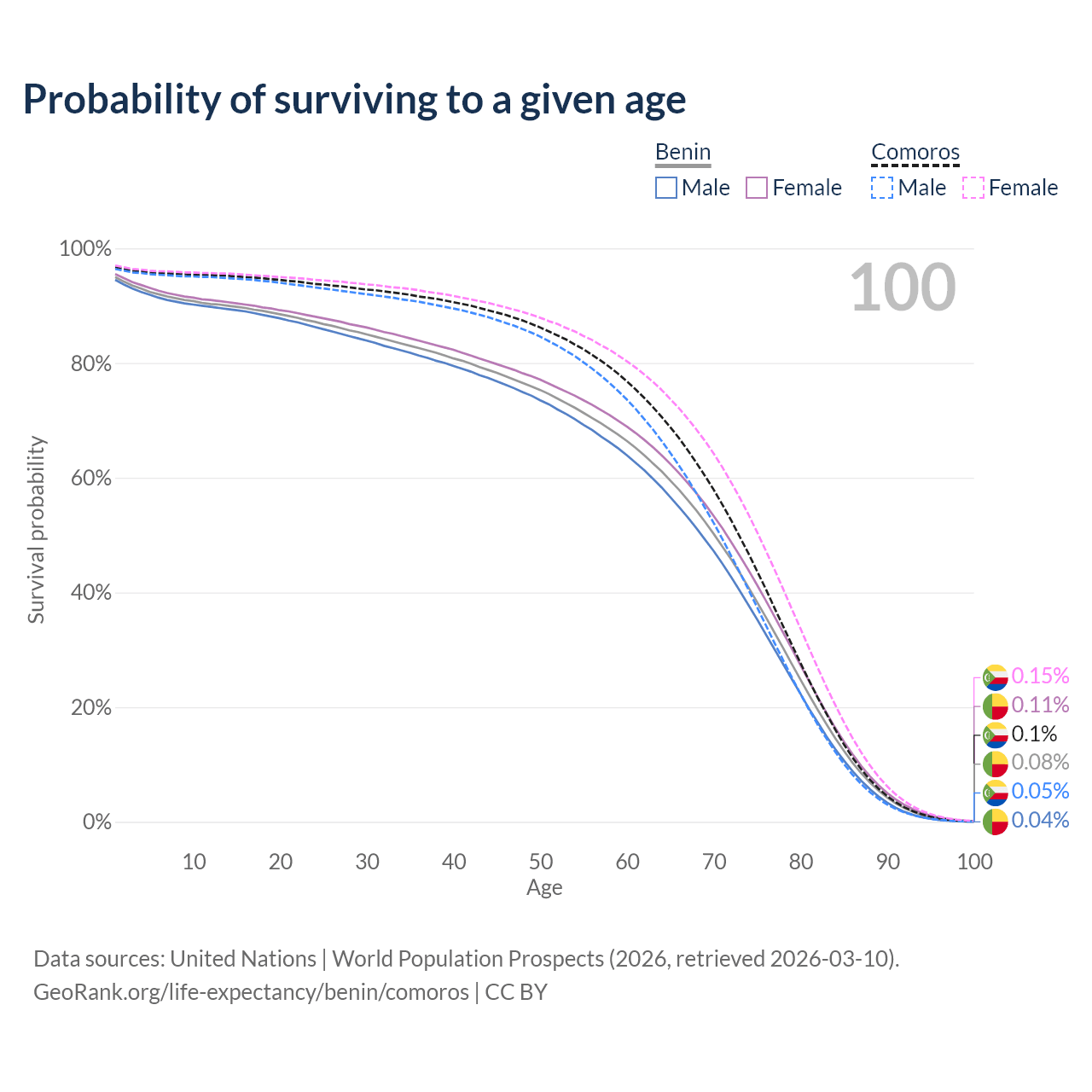 This life expectancy calculator shows the odds of living to 100, 95, 90, and below based on current age for both males and females in Benin and Comoros, along with mean and median age of death. The calculations are based on the 2026 life tables (actuarial tables) from the UN World Population Prospects.