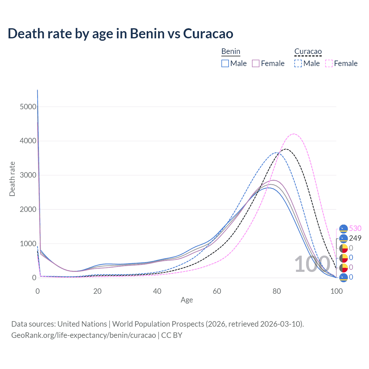 In Benin, the most common age of death is 0, compared to 83 in Curacao. The median age of death is 70.1 in Benin and 80.4 in Curacao, meaning only half of each cohort is expected to live past that age.