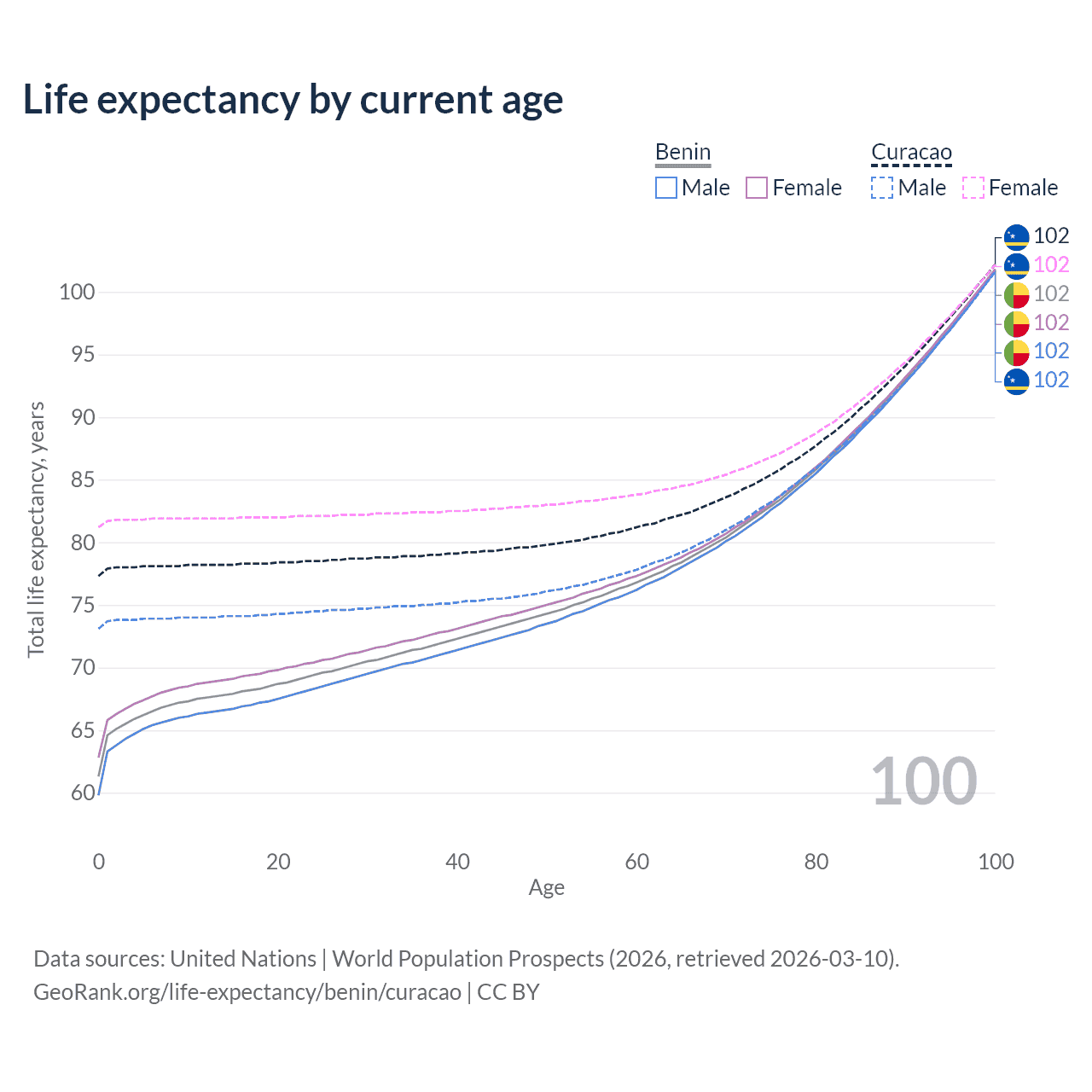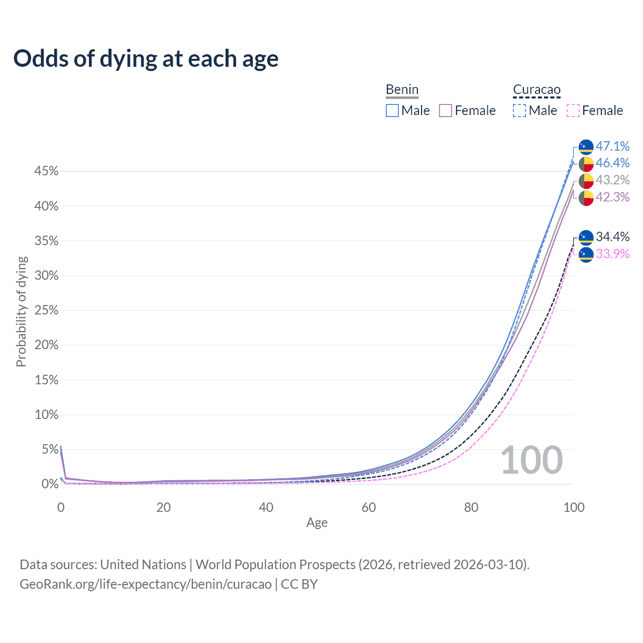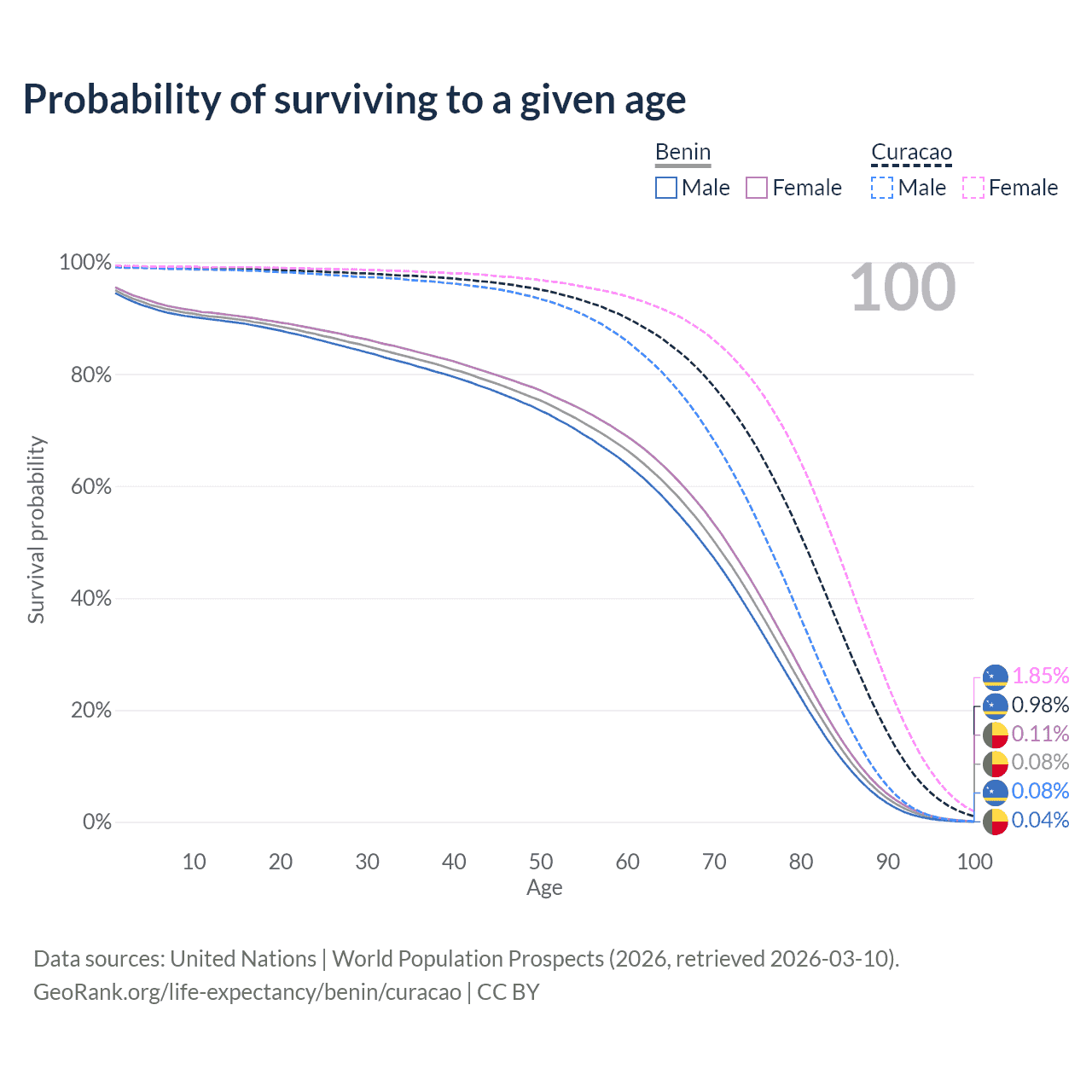 This life expectancy calculator shows the odds of living to 100, 95, 90, and below based on current age for both males and females in Benin and Curacao, along with mean and median age of death. The calculations are based on the 2026 life tables (actuarial tables) from the UN World Population Prospects.