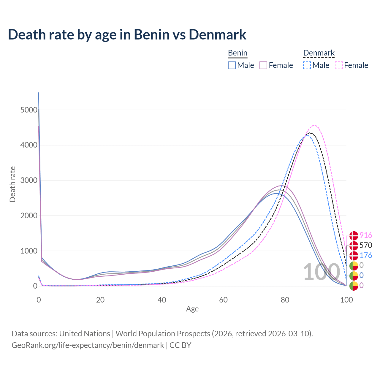 This life expectancy calculator shows the odds of living to 100, 95, 90, and below based on current age for both males and females in Benin and Denmark, along with mean and median age of death. The calculations are based on the 2026 life tables (actuarial tables) from the UN World Population Prospects.