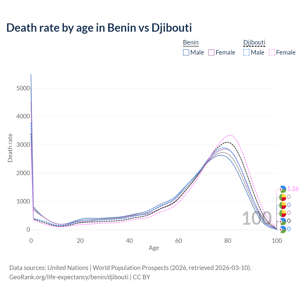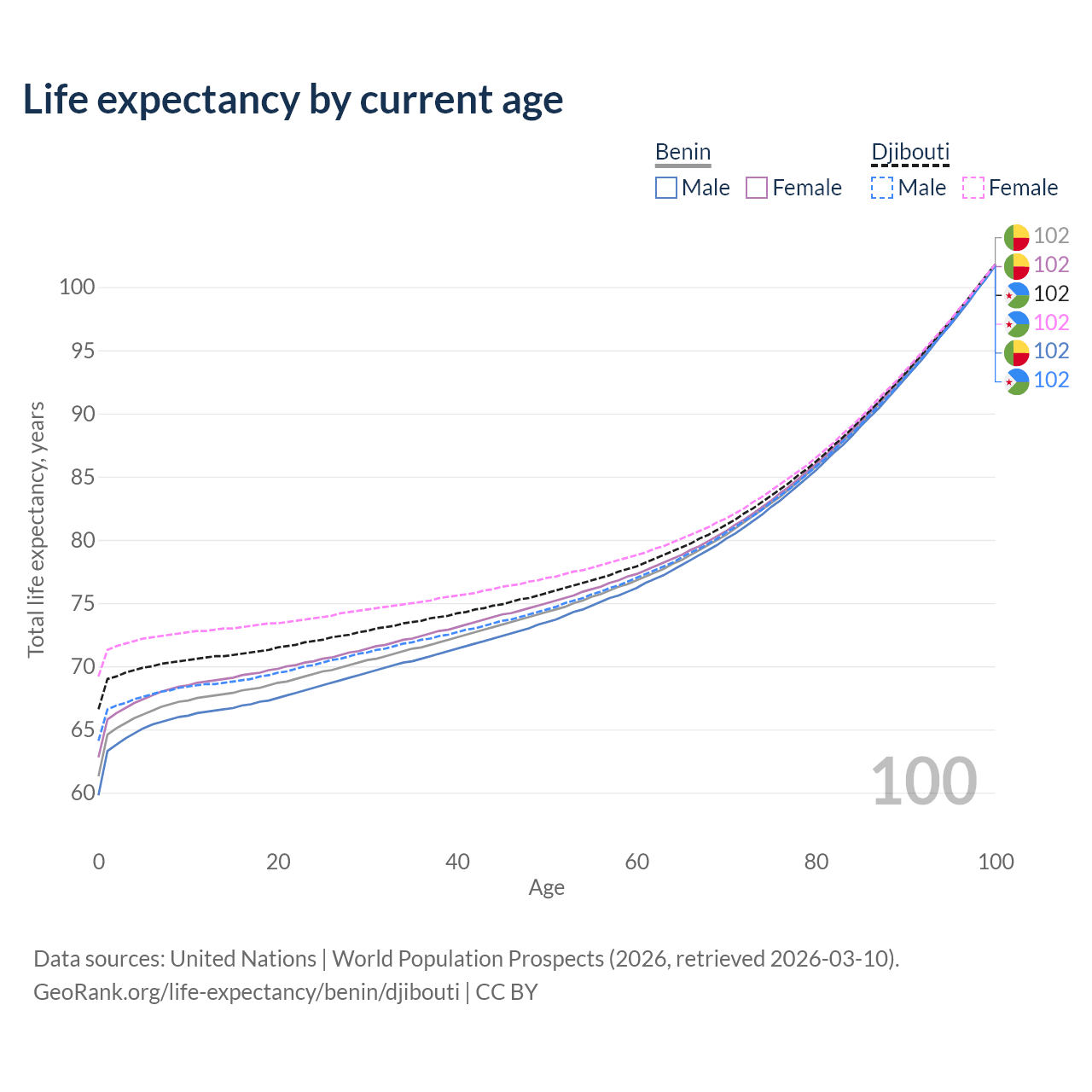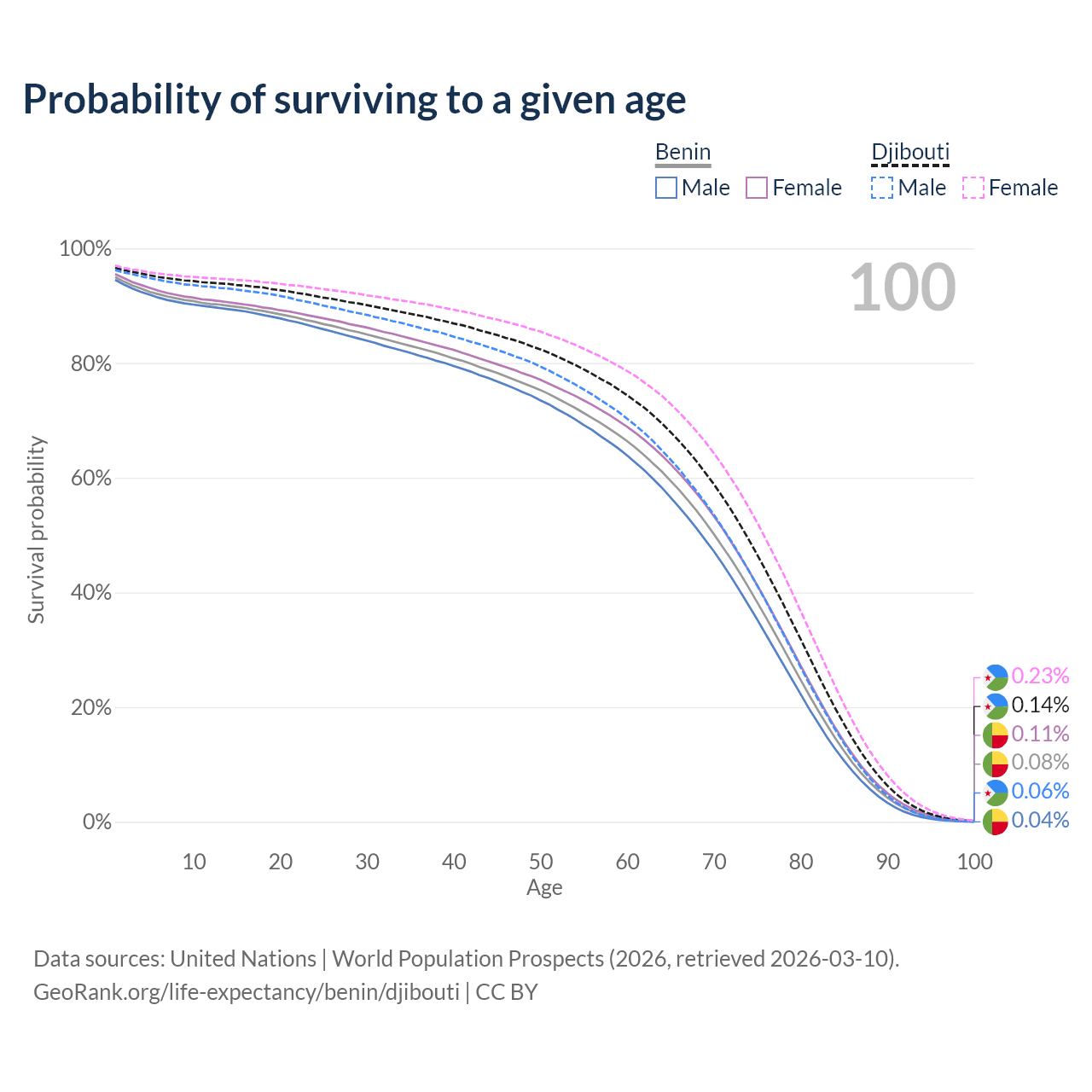 This life expectancy calculator shows the odds of living to 100, 95, 90, and below based on current age for both males and females in Benin and Djibouti, along with mean and median age of death. The calculations are based on the 2026 life tables (actuarial tables) from the UN World Population Prospects.