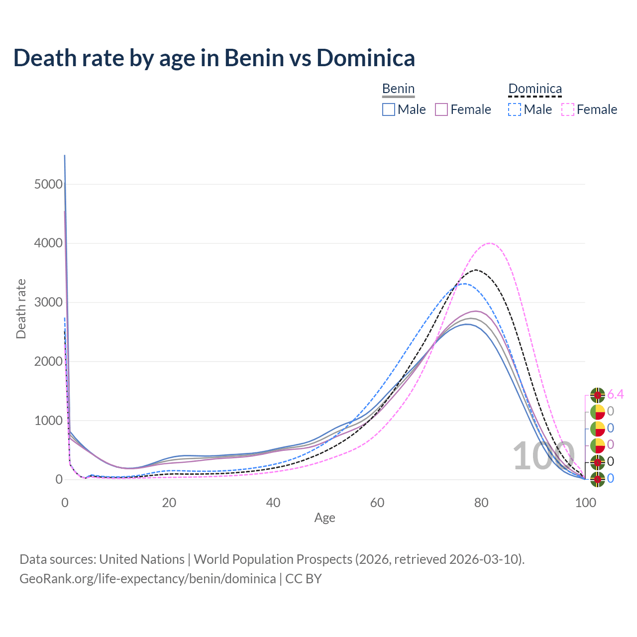 In Benin, the most common age of death is 0, compared to 79 in Dominica. The median age of death is 70.1 in Benin and 75.9 in Dominica, meaning only half of each cohort is expected to live past that age.