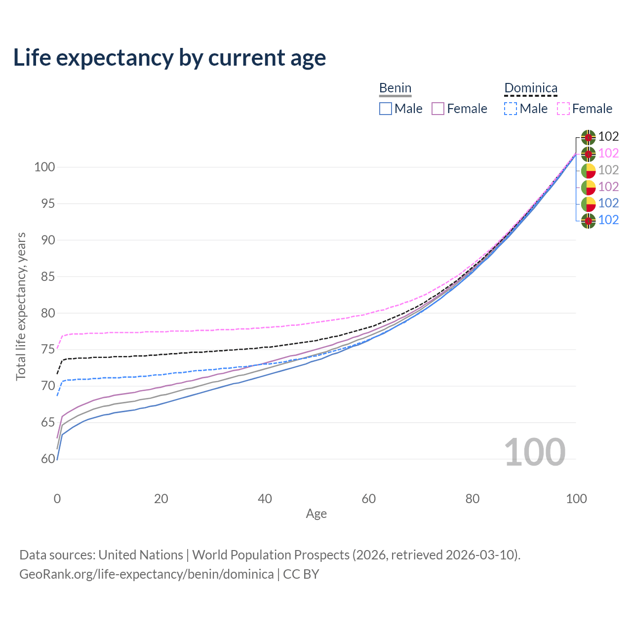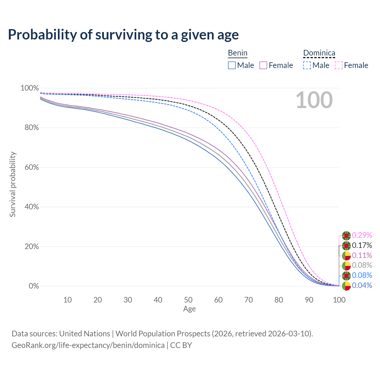 This life expectancy calculator shows the odds of living to 100, 95, 90, and below based on current age for both males and females in Benin and Dominica, along with mean and median age of death. The calculations are based on the 2026 life tables (actuarial tables) from the UN World Population Prospects.