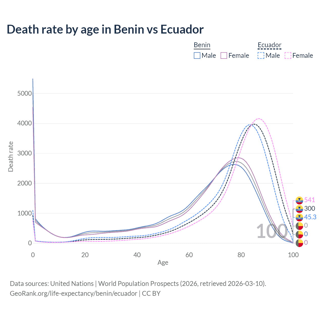 In Benin, the most common age of death is 0, compared to 85 in Ecuador. The median age of death is 70.1 in Benin and 82.3 in Ecuador, meaning only half of each cohort is expected to live past that age.