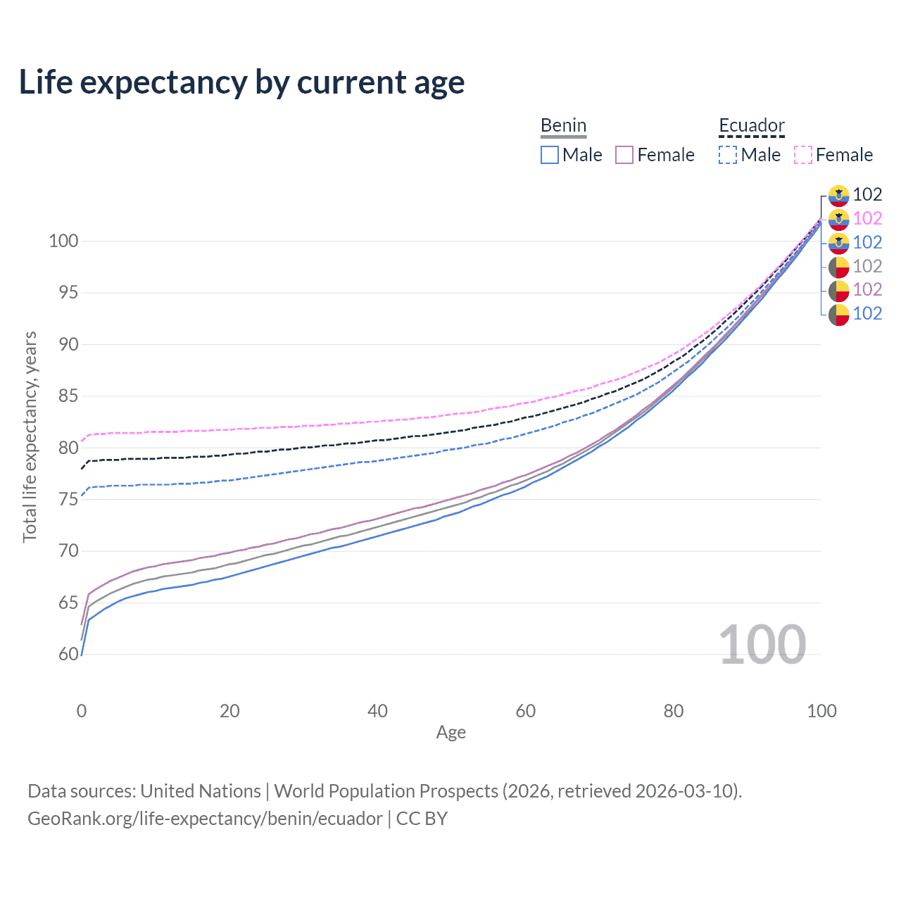 This life expectancy calculator shows the odds of living to 100, 95, 90, and below based on current age for both males and females in Benin and Ecuador, along with mean and median age of death. The calculations are based on the 2026 life tables (actuarial tables) from the UN World Population Prospects.