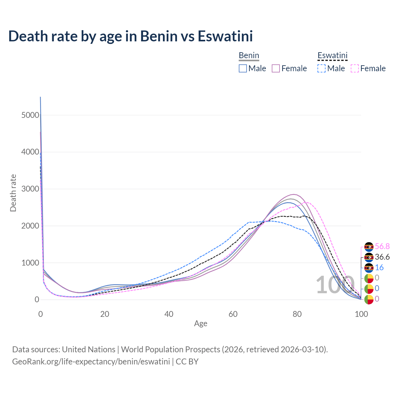 In Benin, the most common age of death is 0, compared to 0 in Eswatini. The median age of death is 70.1 in Benin and 69.7 in Eswatini, meaning only half of each cohort is expected to live past that age.