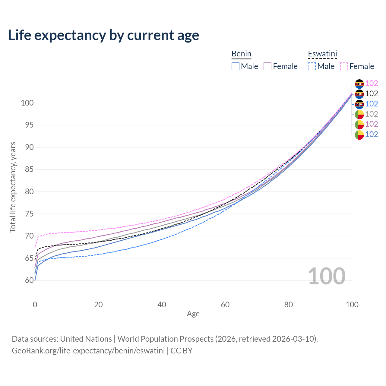 This life expectancy calculator shows the odds of living to 100, 95, 90, and below based on current age for both males and females in Benin and Eswatini, along with mean and median age of death. The calculations are based on the 2026 life tables (actuarial tables) from the UN World Population Prospects.