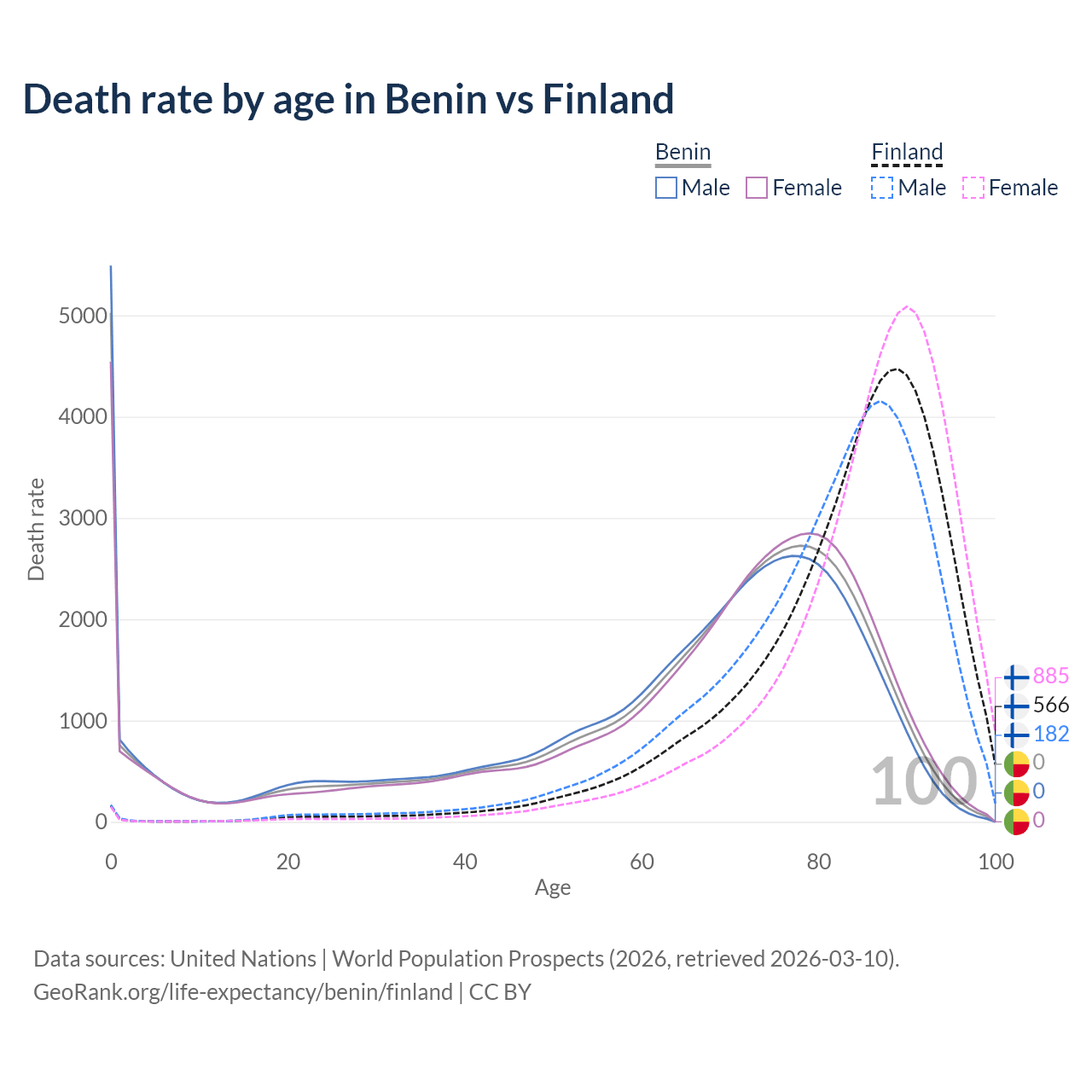 In Benin, the most common age of death is 0, compared to 89 in Finland. The median age of death is 70.1 in Benin and 85.6 in Finland, meaning only half of each cohort is expected to live past that age.