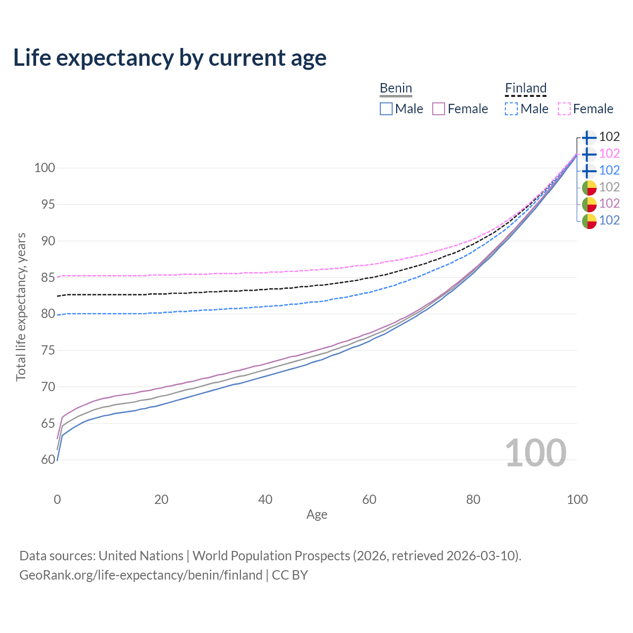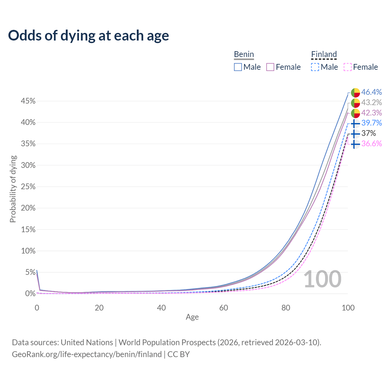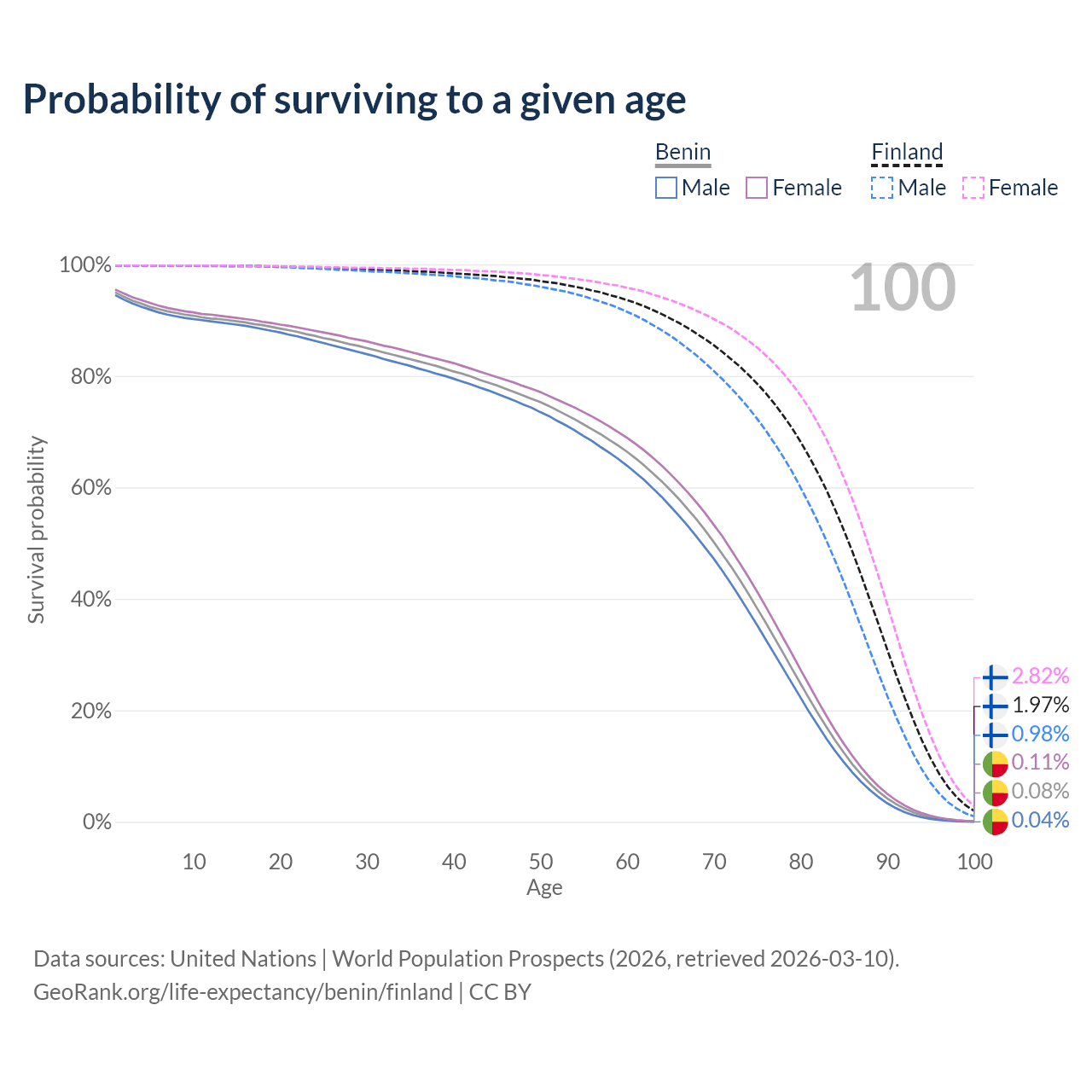 This life expectancy calculator shows the odds of living to 100, 95, 90, and below based on current age for both males and females in Benin and Finland, along with mean and median age of death. The calculations are based on the 2026 life tables (actuarial tables) from the UN World Population Prospects.