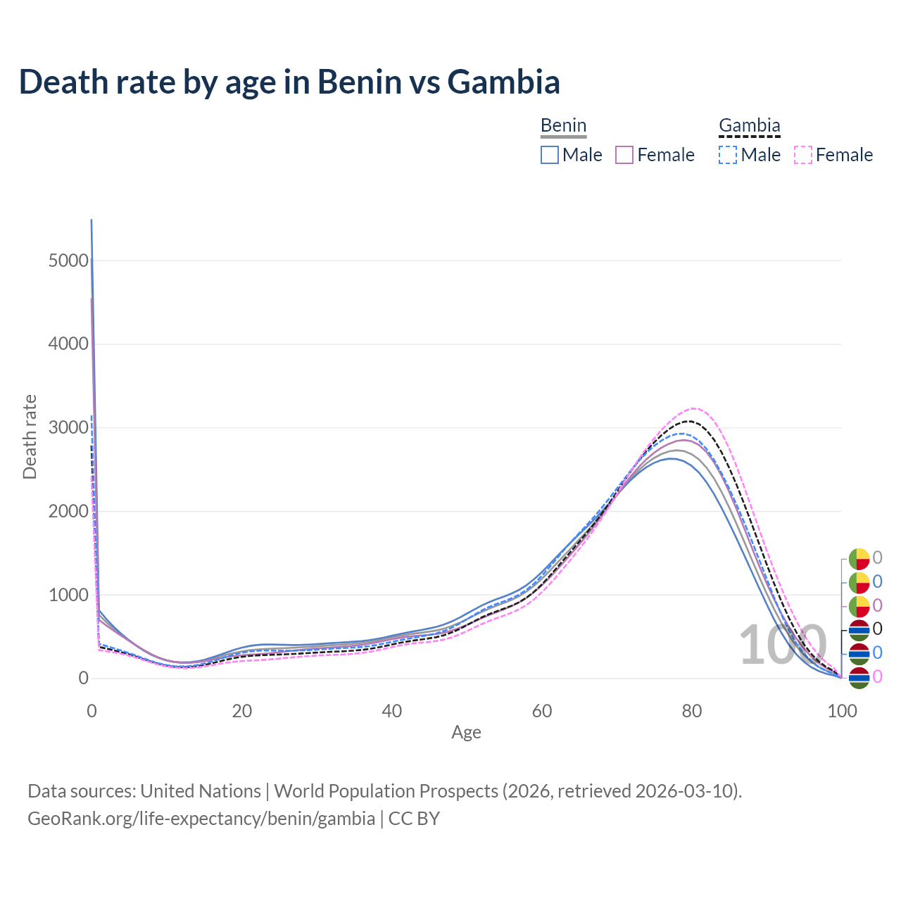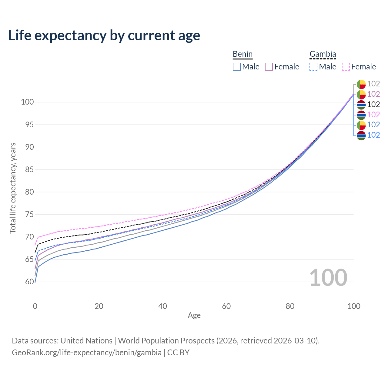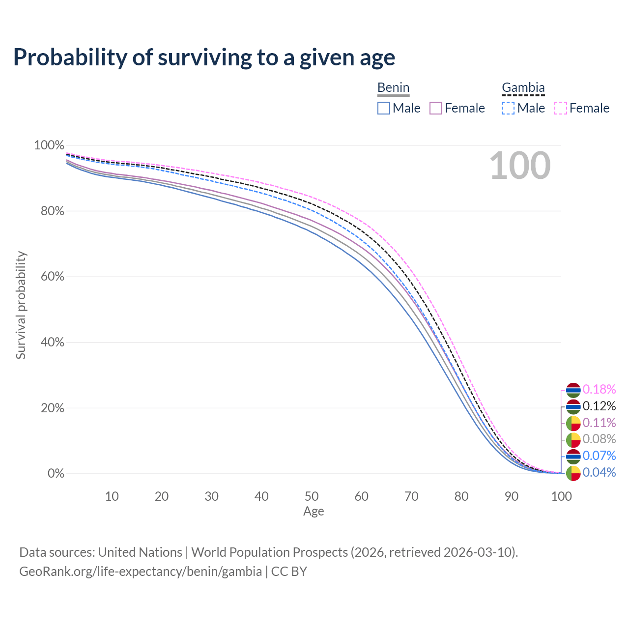 This life expectancy calculator shows the odds of living to 100, 95, 90, and below based on current age for both males and females in Benin and the Gambia, along with mean and median age of death. The calculations are based on the 2026 life tables (actuarial tables) from the UN World Population Prospects.