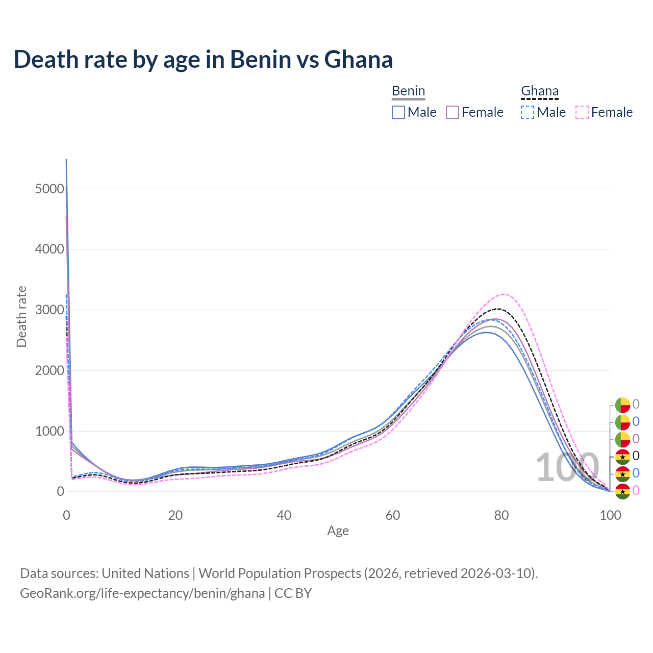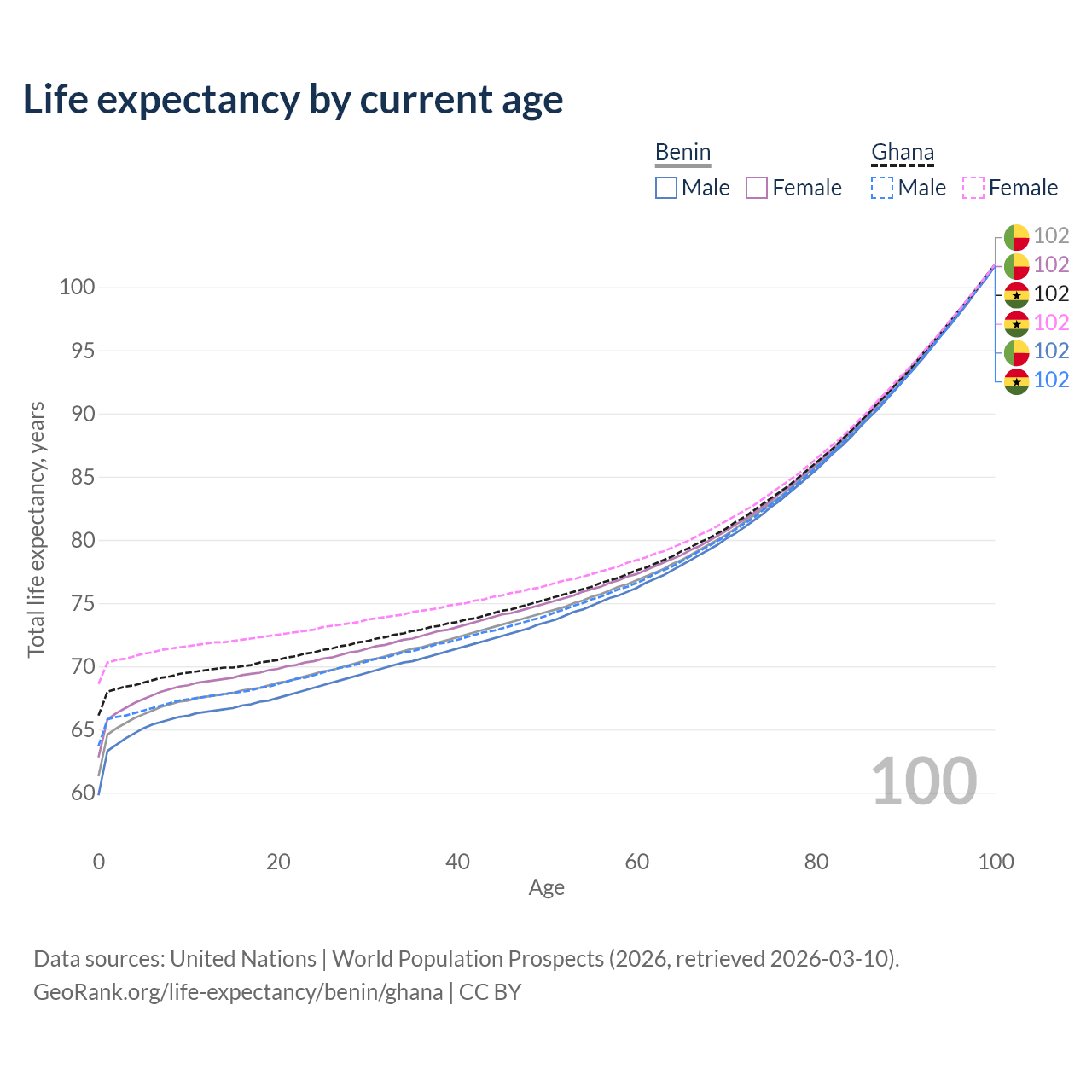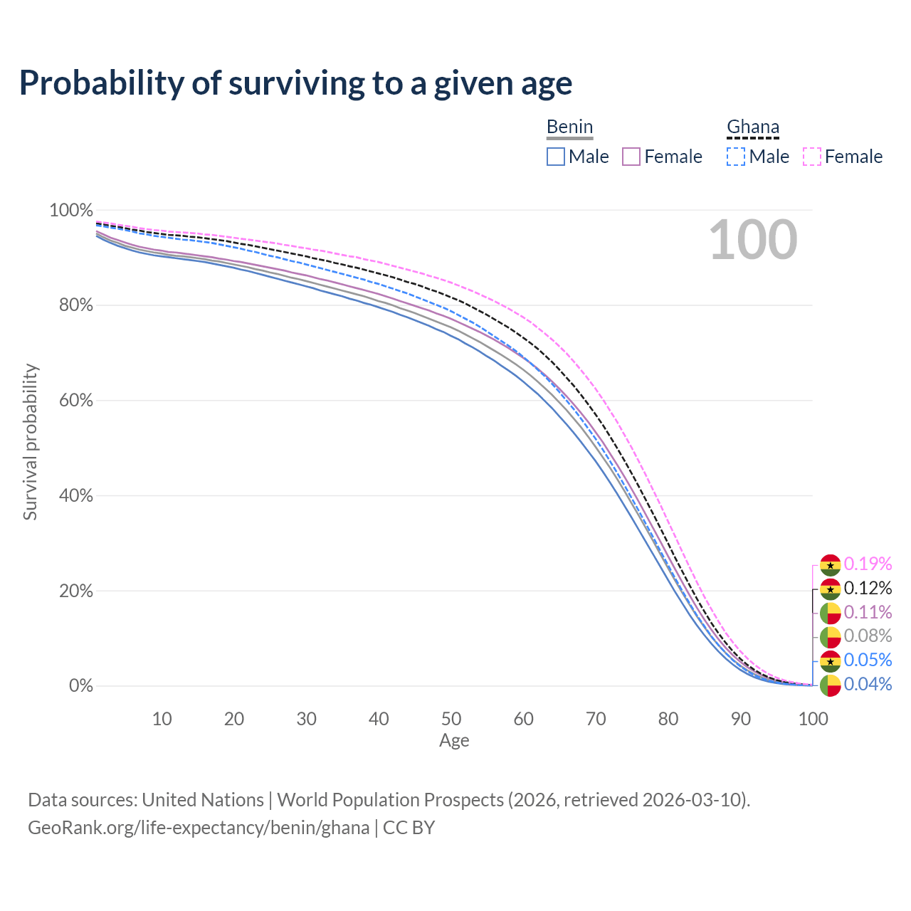 This life expectancy calculator shows the odds of living to 100, 95, 90, and below based on current age for both males and females in Benin and Ghana, along with mean and median age of death. The calculations are based on the 2026 life tables (actuarial tables) from the UN World Population Prospects.
