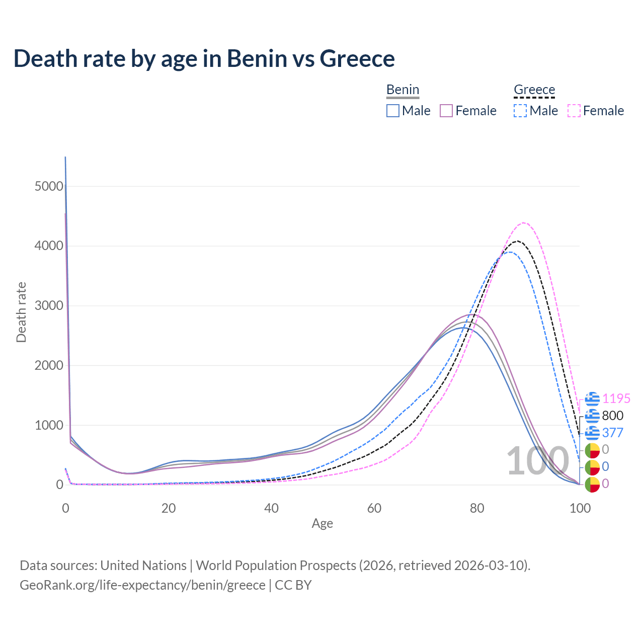 In Benin, the most common age of death is 0, compared to 88 in Greece. The median age of death is 70.1 in Benin and 84.9 in Greece, meaning only half of each cohort is expected to live past that age.