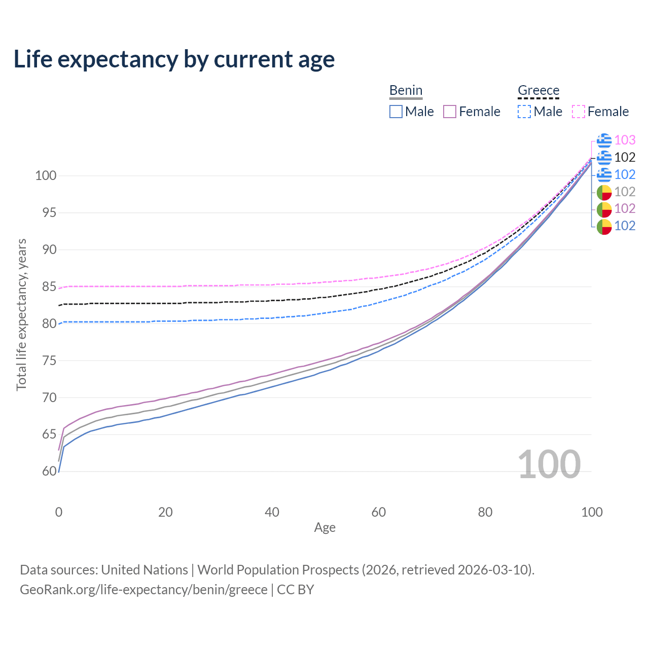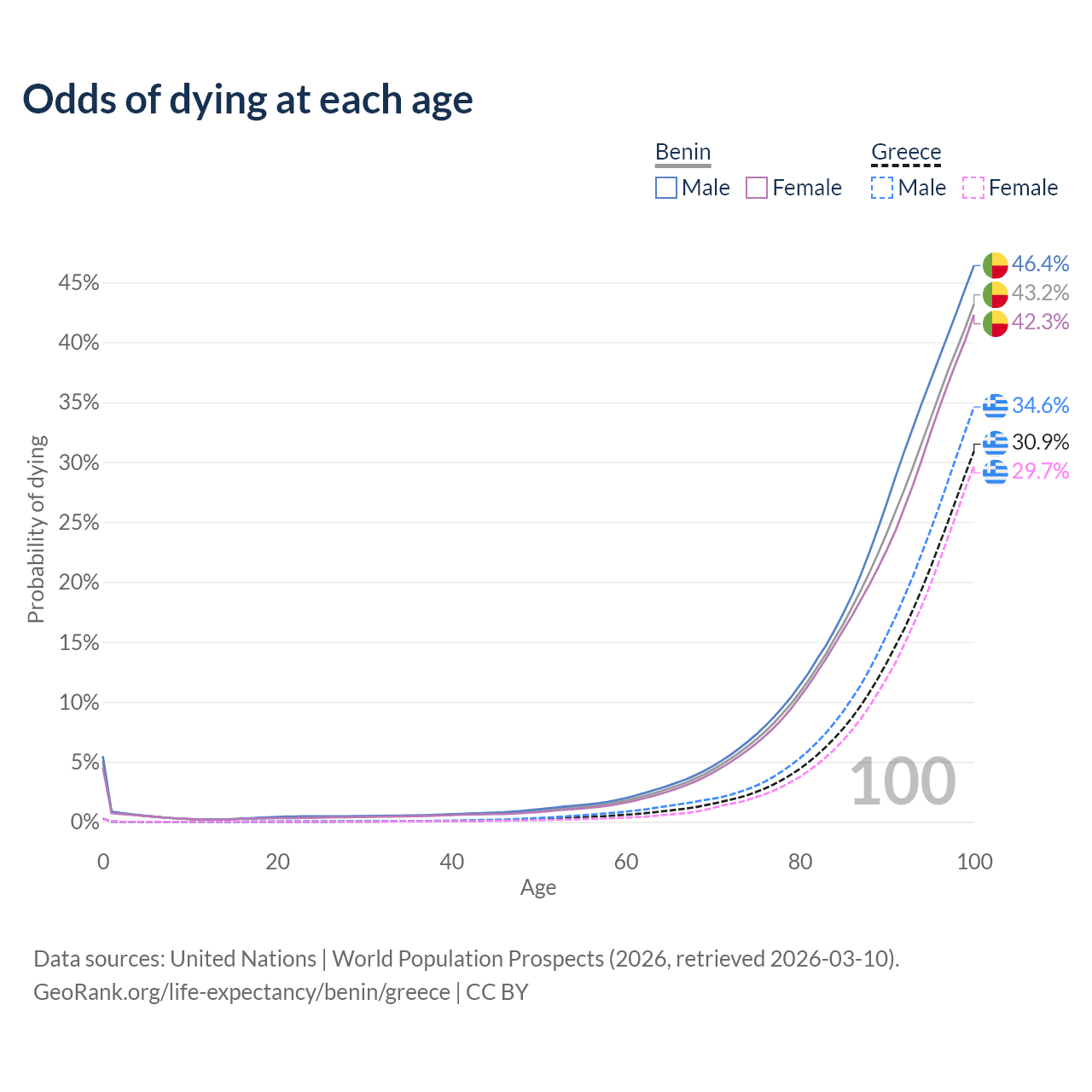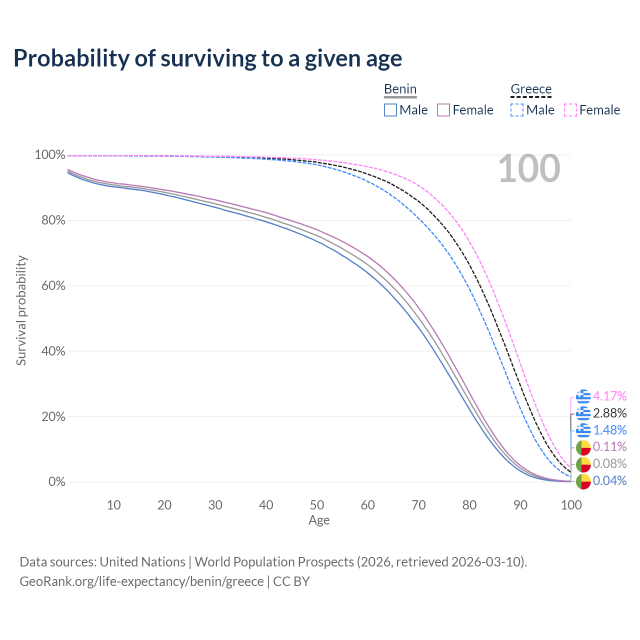 This life expectancy calculator shows the odds of living to 100, 95, 90, and below based on current age for both males and females in Benin and Greece, along with mean and median age of death. The calculations are based on the 2026 life tables (actuarial tables) from the UN World Population Prospects.