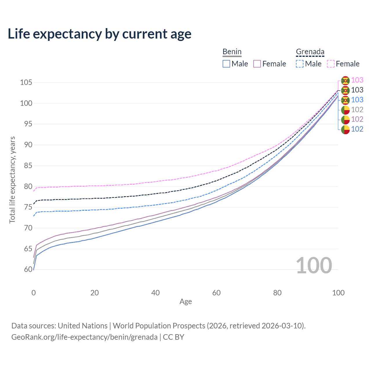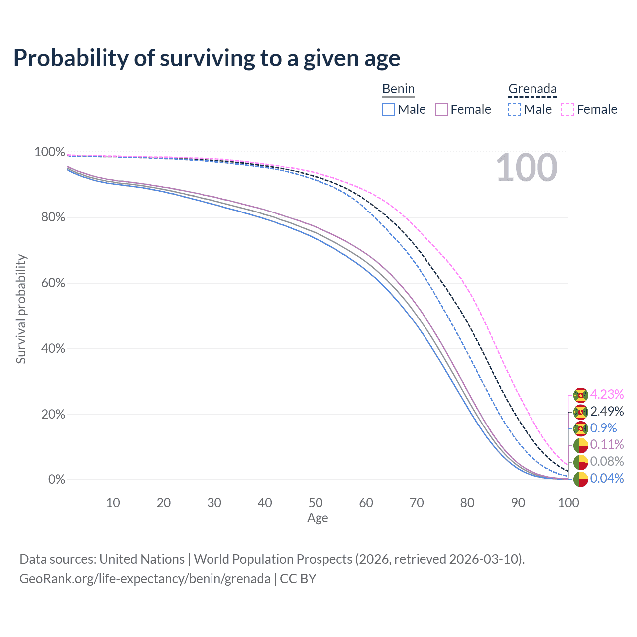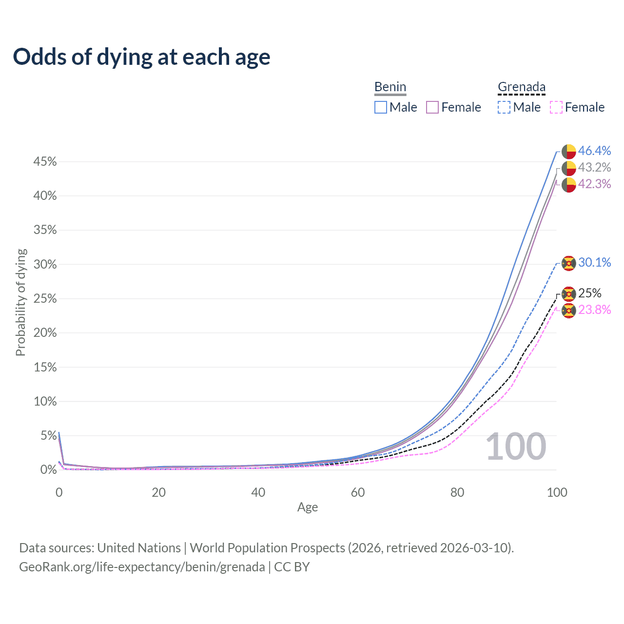 This life expectancy calculator shows the odds of living to 100, 95, 90, and below based on current age for both males and females in Benin and Grenada, along with mean and median age of death. The calculations are based on the 2026 life tables (actuarial tables) from the UN World Population Prospects.