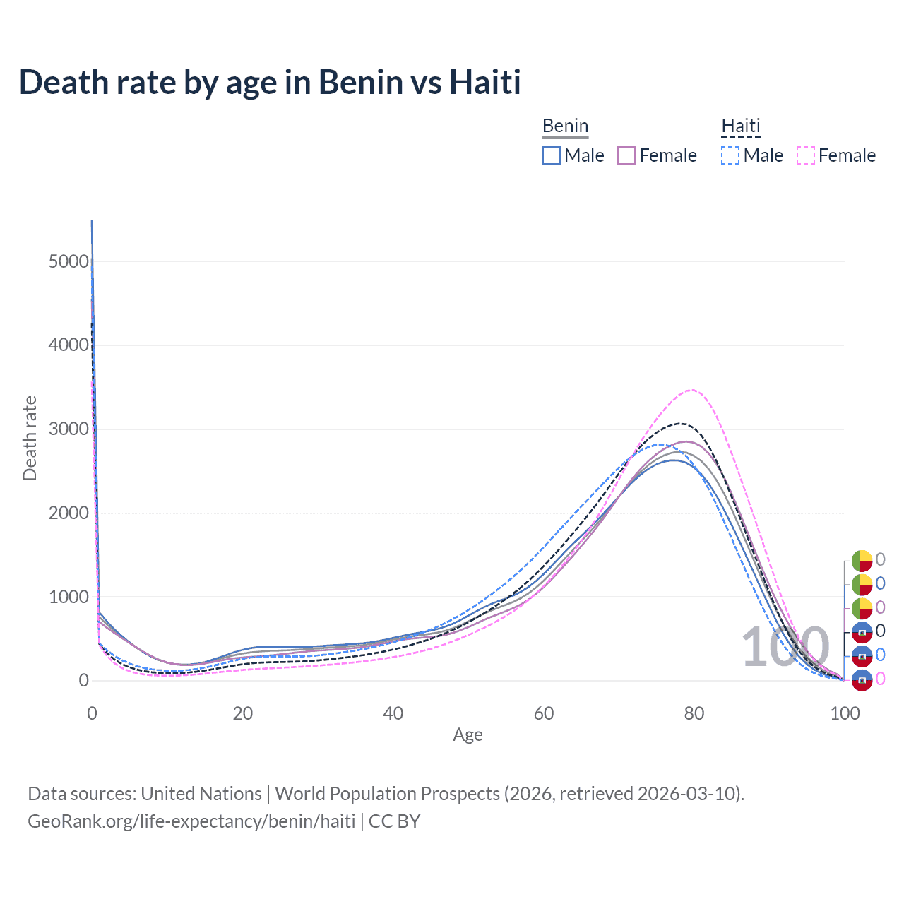 In Benin, the most common age of death is 0, compared to 0 in Haiti. The median age of death is 70.1 in Benin and 72 in Haiti, meaning only half of each cohort is expected to live past that age.