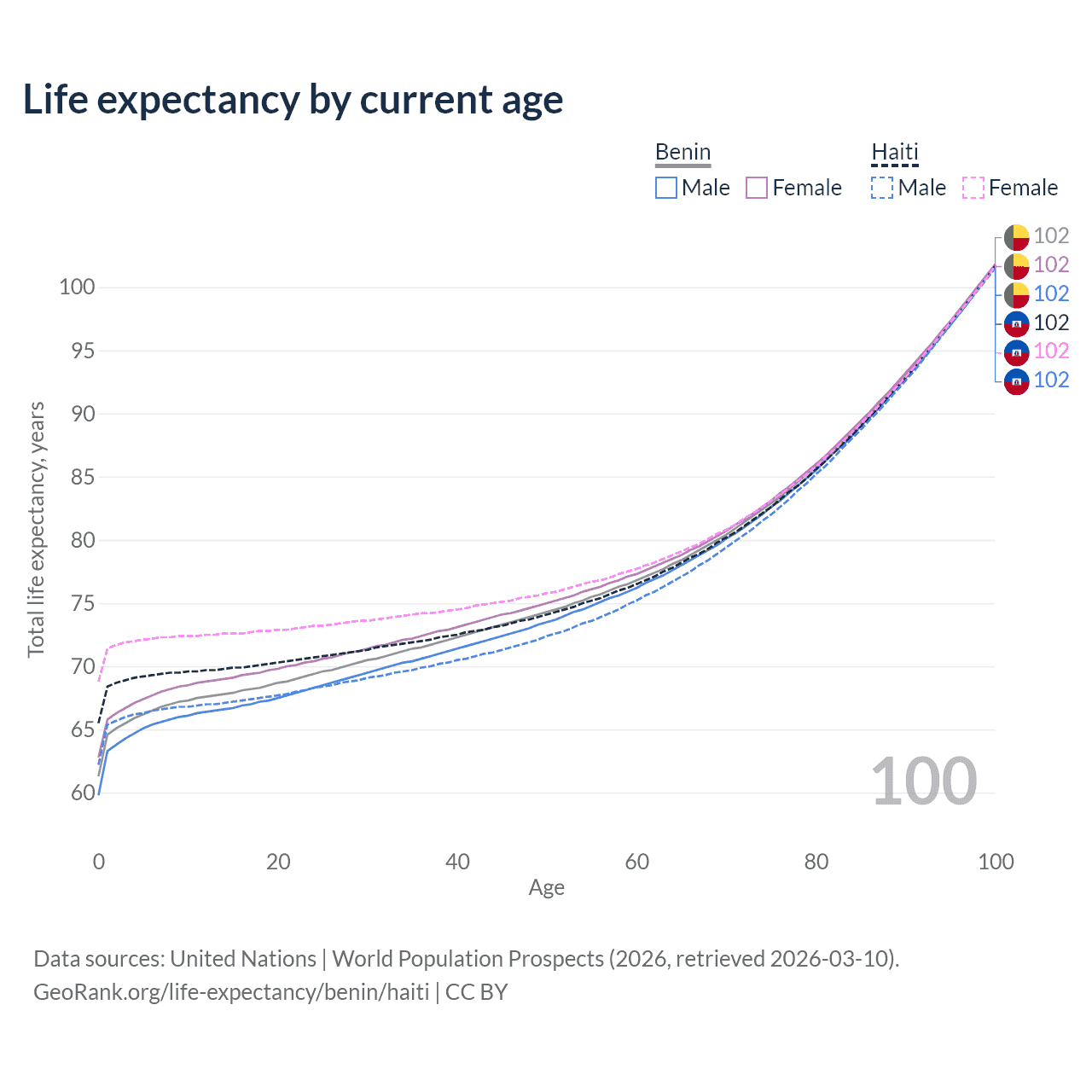 This life expectancy calculator shows the odds of living to 100, 95, 90, and below based on current age for both males and females in Benin and Haiti, along with mean and median age of death. The calculations are based on the 2026 life tables (actuarial tables) from the UN World Population Prospects.