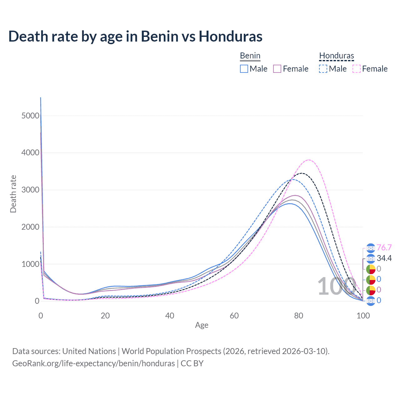 In Benin, the most common age of death is 0, compared to 81 in Honduras. The median age of death is 70.1 in Benin and 77.1 in Honduras, meaning only half of each cohort is expected to live past that age.