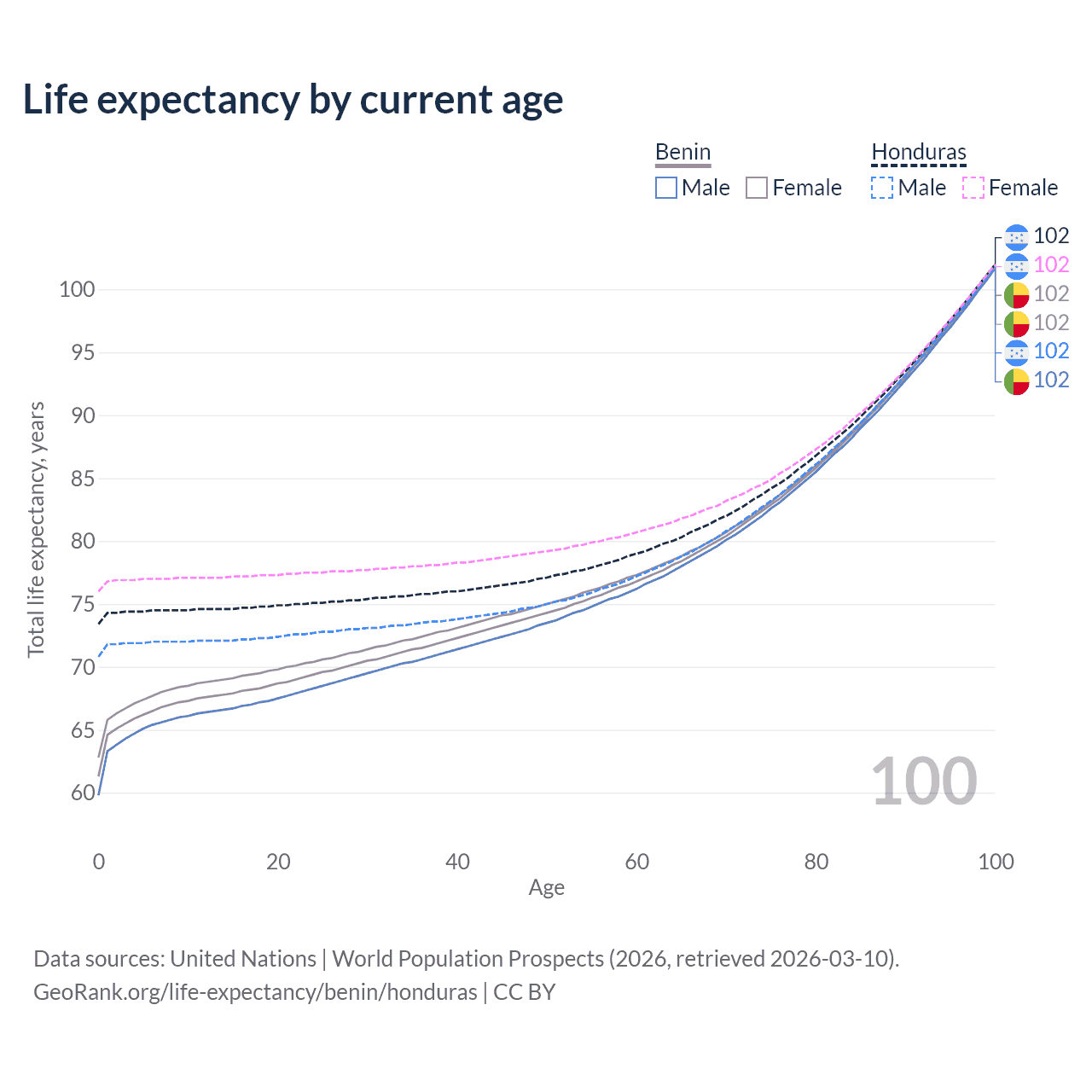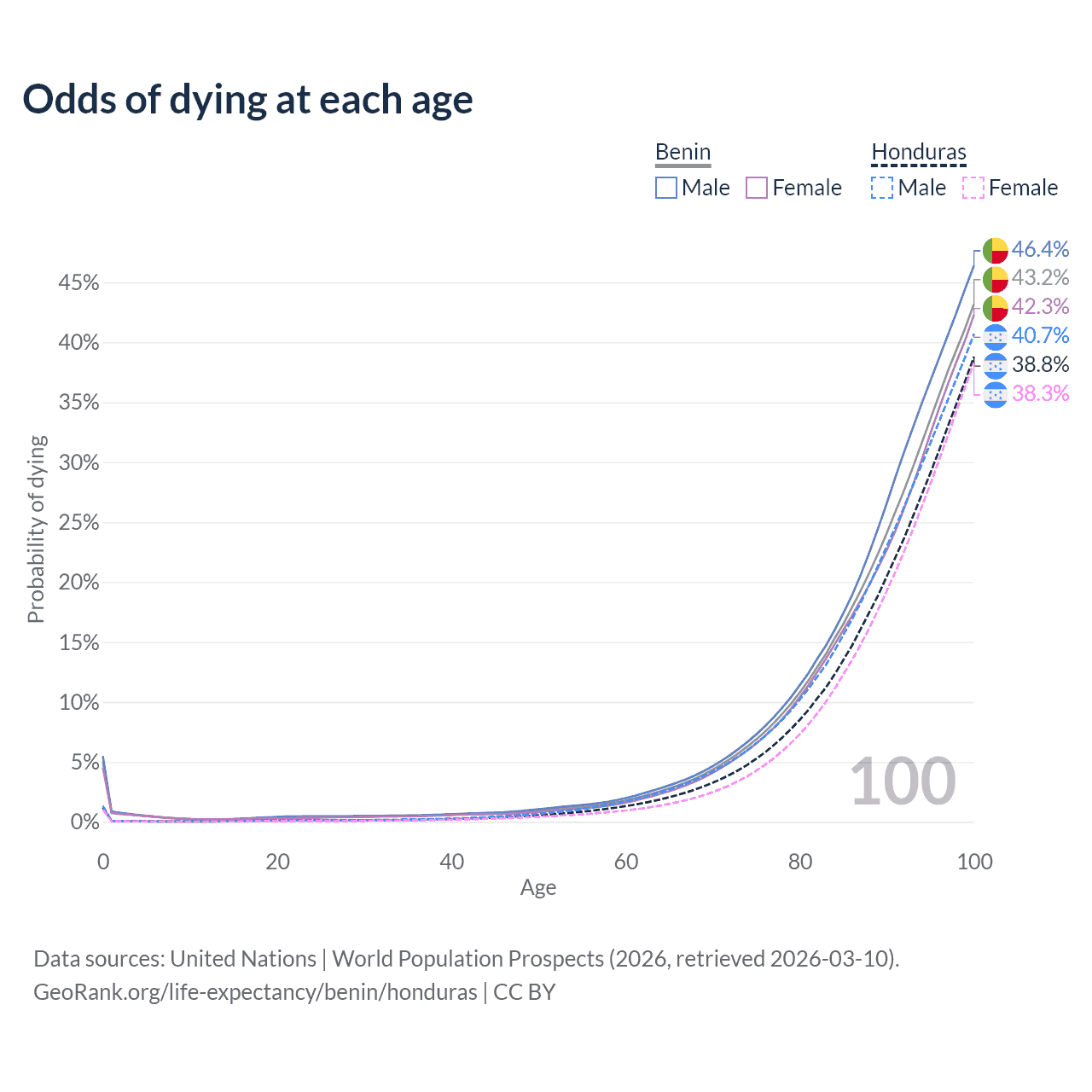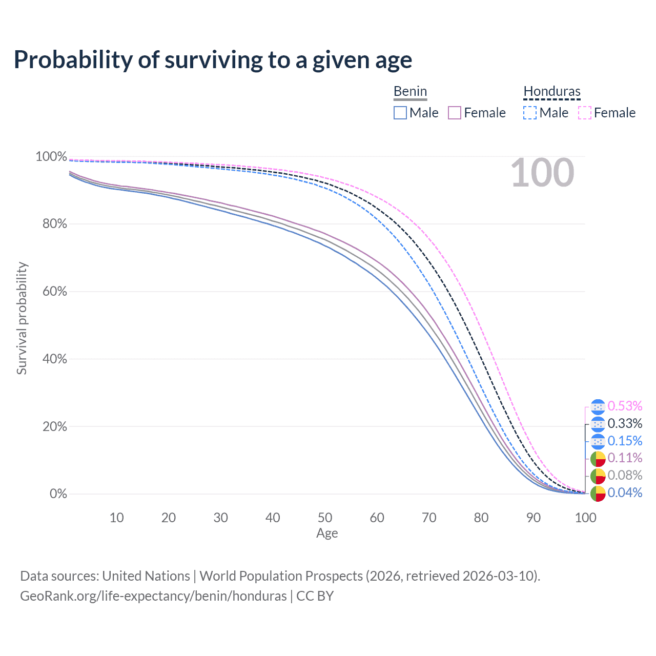 This life expectancy calculator shows the odds of living to 100, 95, 90, and below based on current age for both males and females in Benin and Honduras, along with mean and median age of death. The calculations are based on the 2026 life tables (actuarial tables) from the UN World Population Prospects.