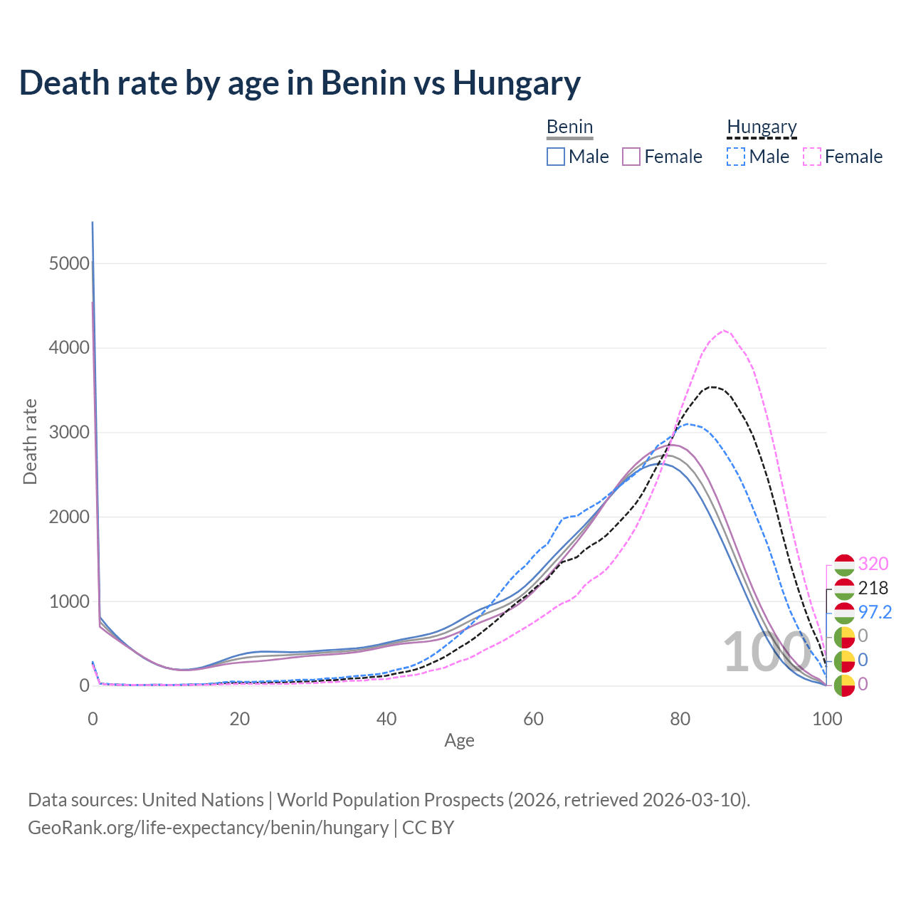 In Benin, the most common age of death is 0, compared to 84 in Hungary. The median age of death is 70.1 in Benin and 80.4 in Hungary, meaning only half of each cohort is expected to live past that age.