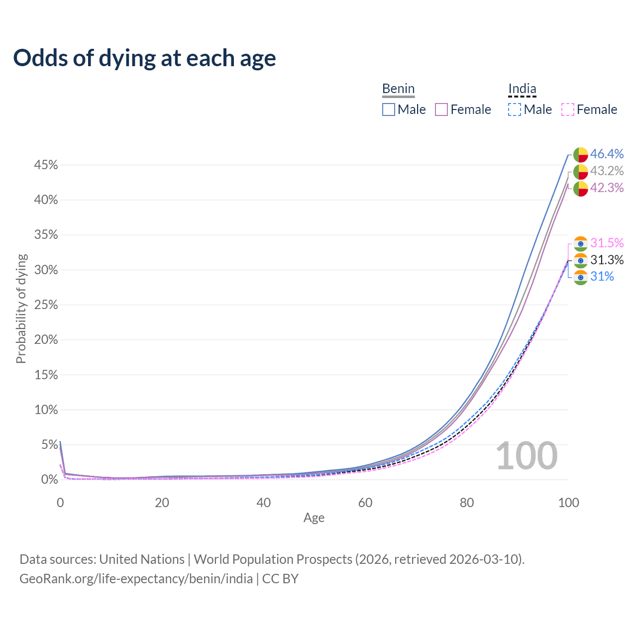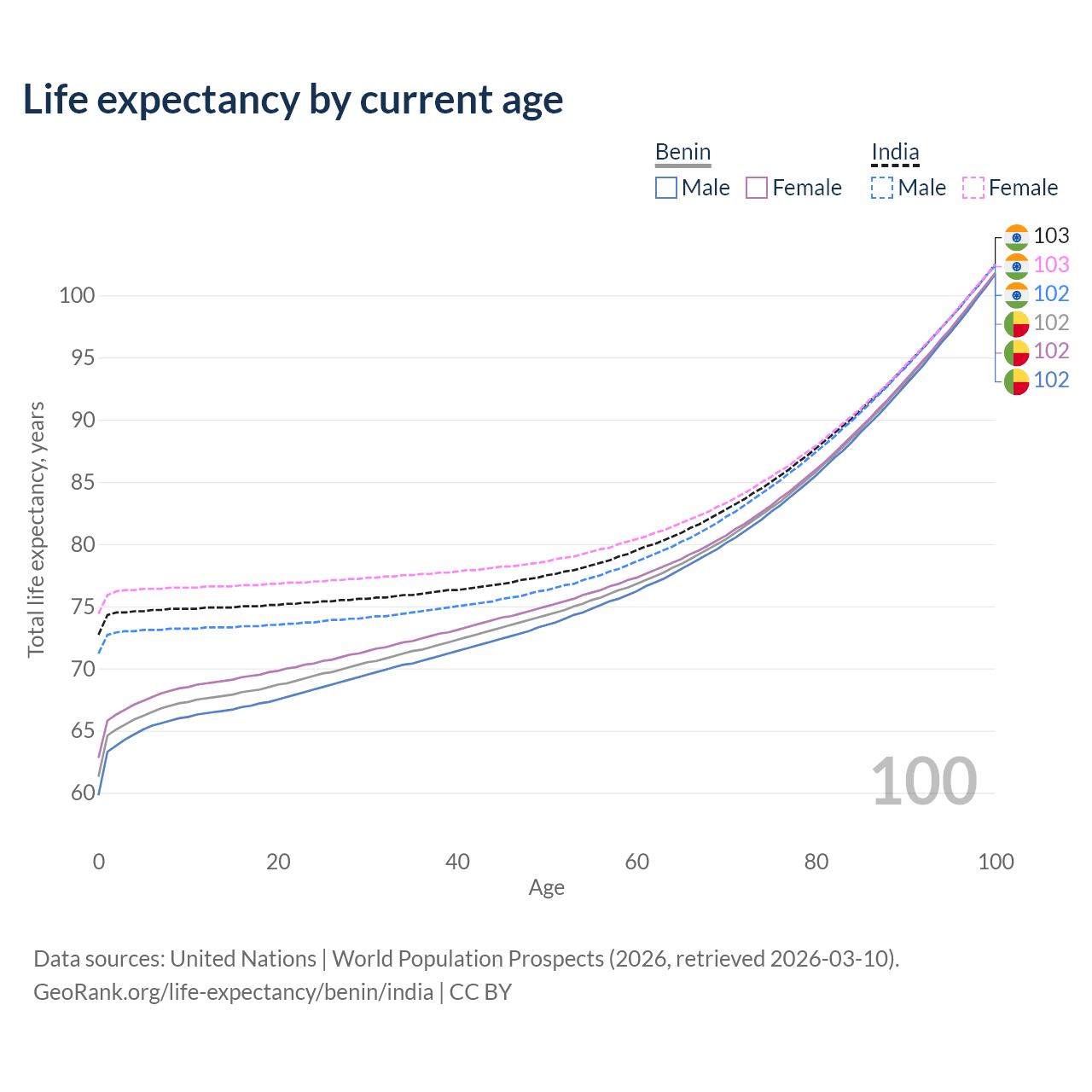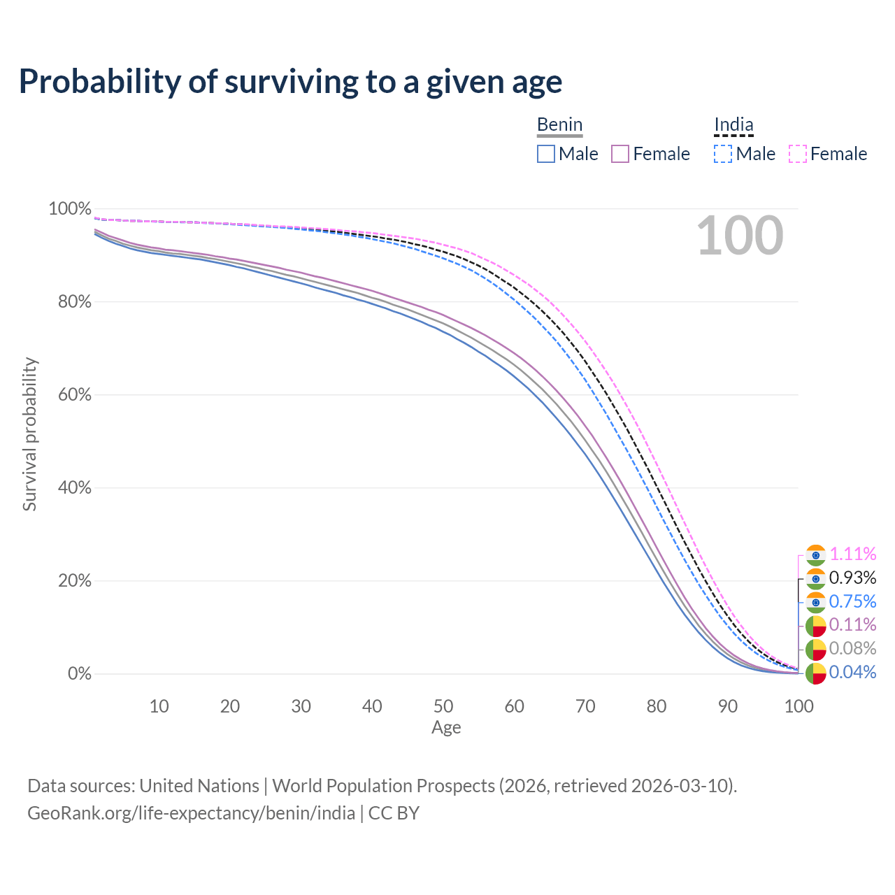This life expectancy calculator shows the odds of living to 100, 95, 90, and below based on current age for both males and females in Benin and India, along with mean and median age of death. The calculations are based on the 2026 life tables (actuarial tables) from the UN World Population Prospects.