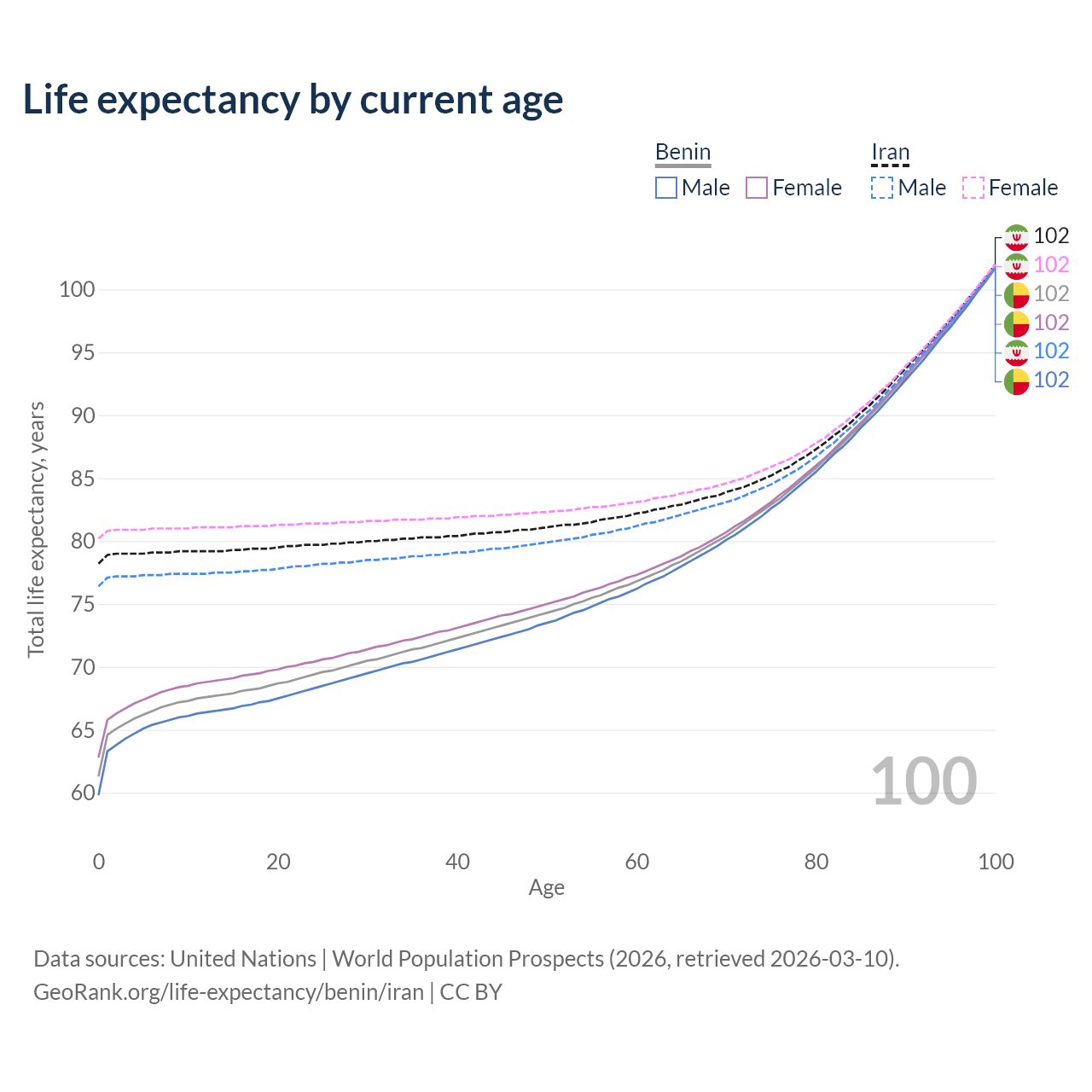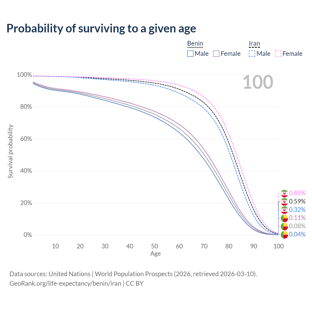 This life expectancy calculator shows the odds of living to 100, 95, 90, and below based on current age for both males and females in Benin and Iran, along with mean and median age of death. The calculations are based on the 2026 life tables (actuarial tables) from the UN World Population Prospects.