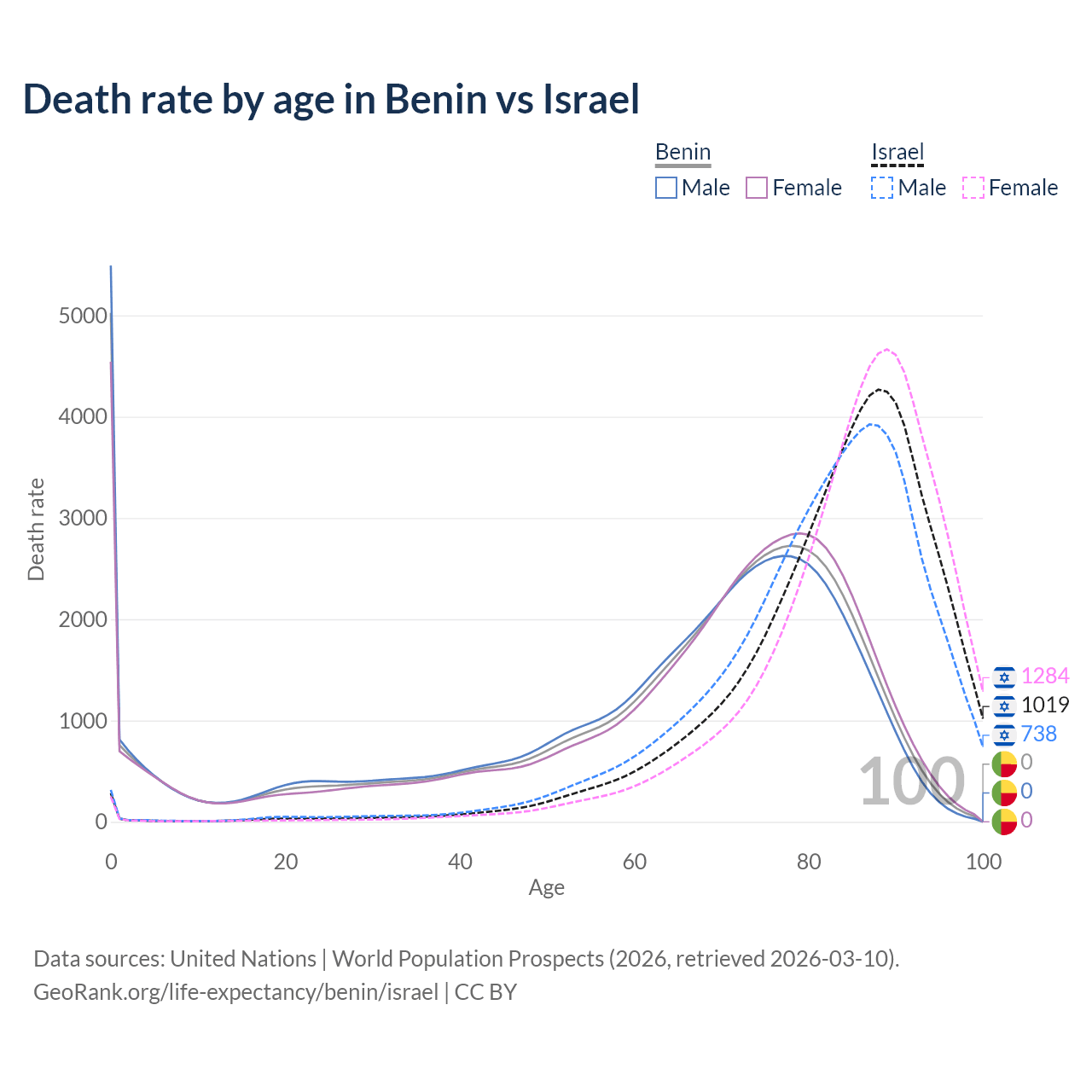 In Benin, the most common age of death is 0, compared to 88 in Israel. The median age of death is 70.1 in Benin and 85.6 in Israel, meaning only half of each cohort is expected to live past that age.