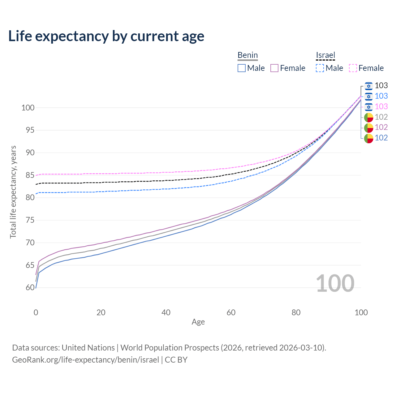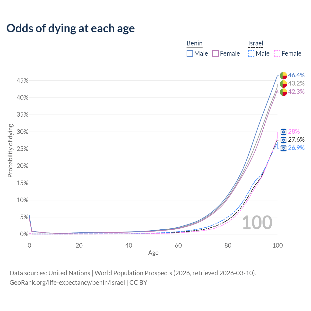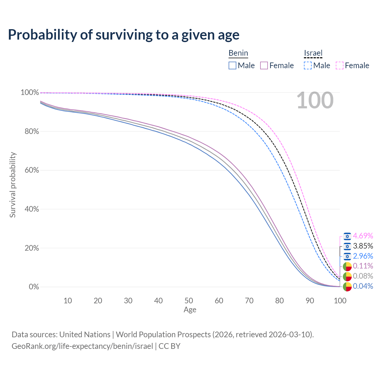 This life expectancy calculator shows the odds of living to 100, 95, 90, and below based on current age for both males and females in Benin and Israel, along with mean and median age of death. The calculations are based on the 2026 life tables (actuarial tables) from the UN World Population Prospects.