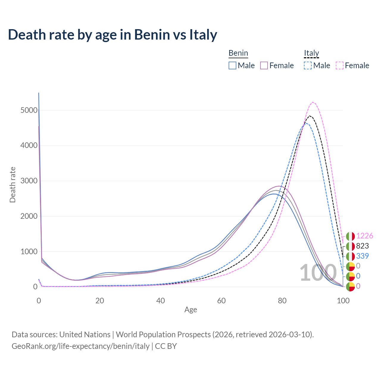 This life expectancy calculator shows the odds of living to 100, 95, 90, and below based on current age for both males and females in Benin and Italy, along with mean and median age of death. The calculations are based on the 2026 life tables (actuarial tables) from the UN World Population Prospects.