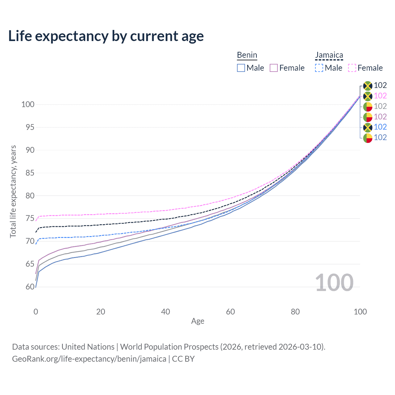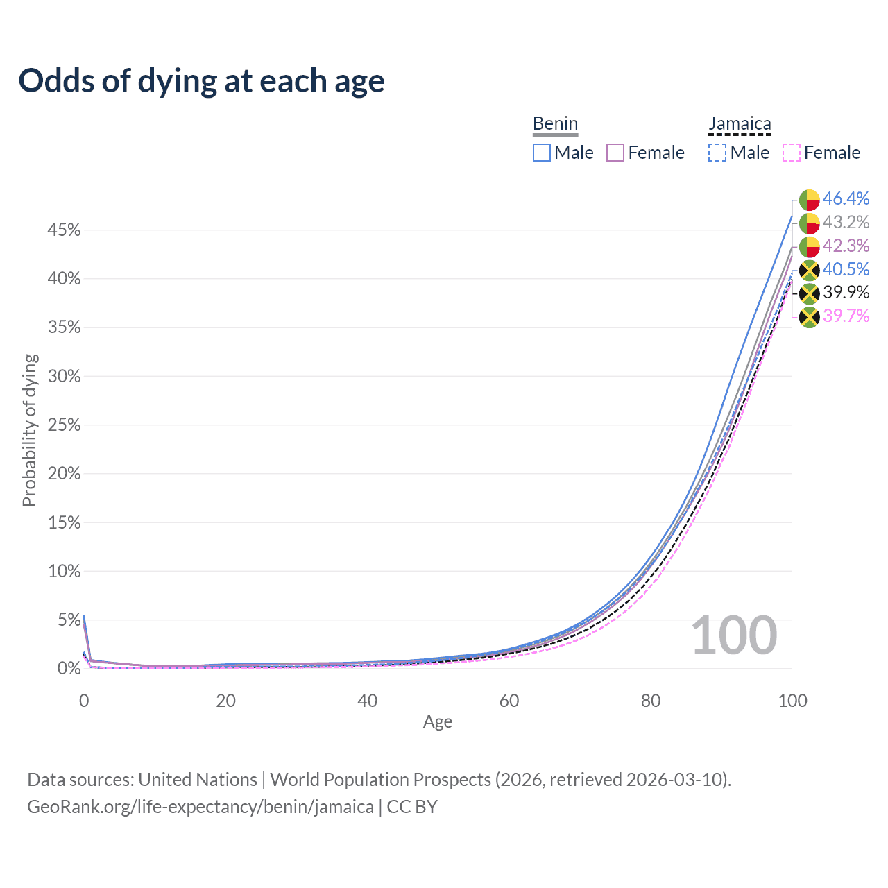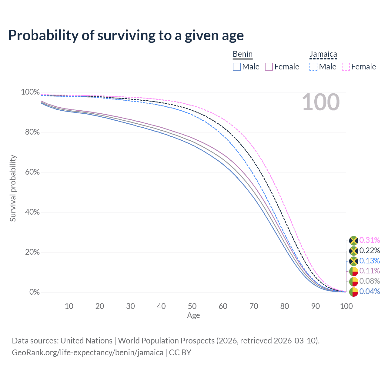 This life expectancy calculator shows the odds of living to 100, 95, 90, and below based on current age for both males and females in Benin and Jamaica, along with mean and median age of death. The calculations are based on the 2026 life tables (actuarial tables) from the UN World Population Prospects.