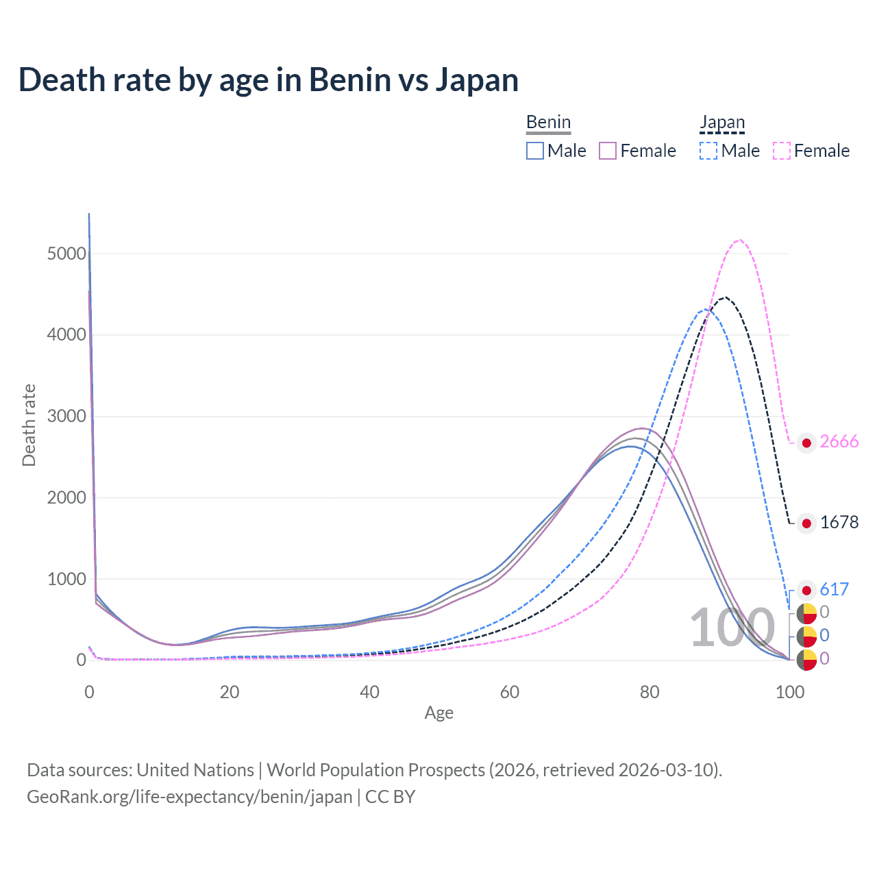 In Benin, the most common age of death is 0, compared to 91 in Japan. The median age of death is 70.1 in Benin and 88.1 in Japan, meaning only half of each cohort is expected to live past that age.