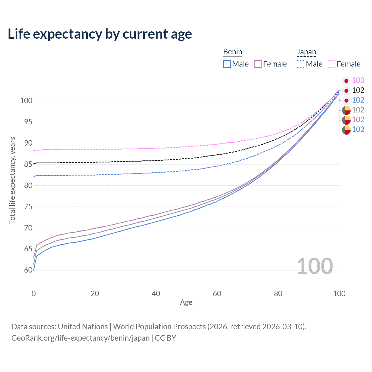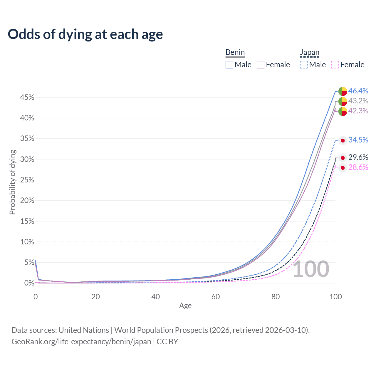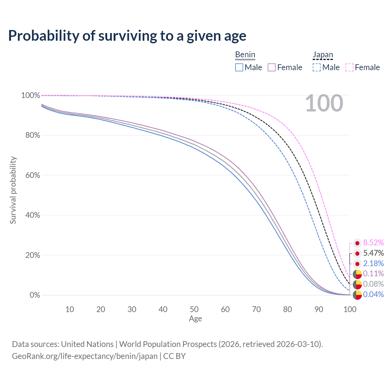 This life expectancy calculator shows the odds of living to 100, 95, 90, and below based on current age for both males and females in Benin and Japan, along with mean and median age of death. The calculations are based on the 2026 life tables (actuarial tables) from the UN World Population Prospects.