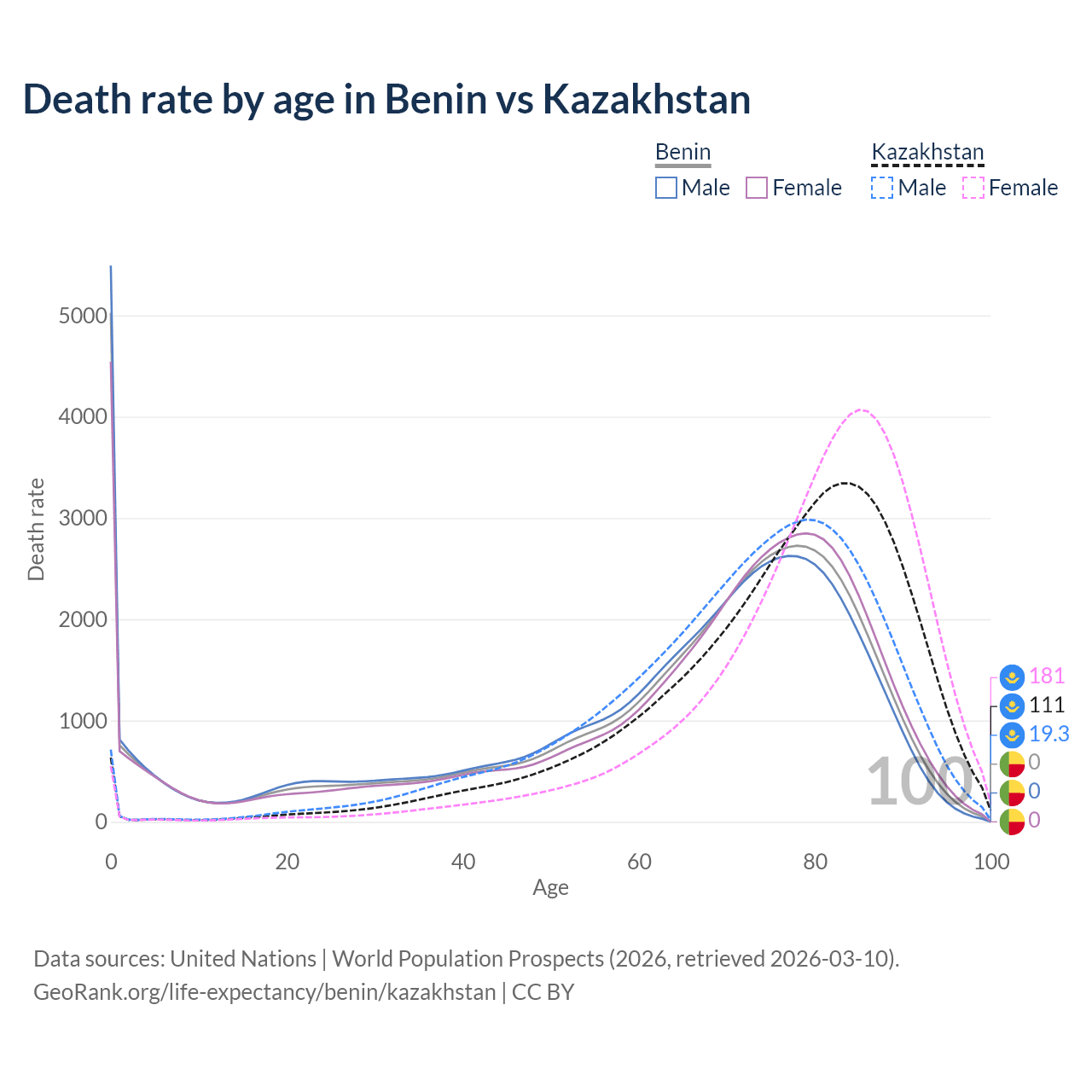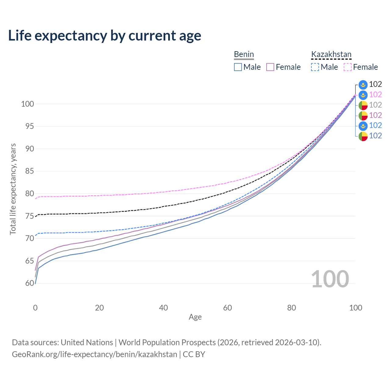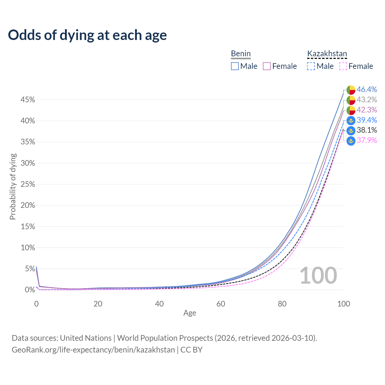 This life expectancy calculator shows the odds of living to 100, 95, 90, and below based on current age for both males and females in Benin and Kazakhstan, along with mean and median age of death. The calculations are based on the 2026 life tables (actuarial tables) from the UN World Population Prospects.