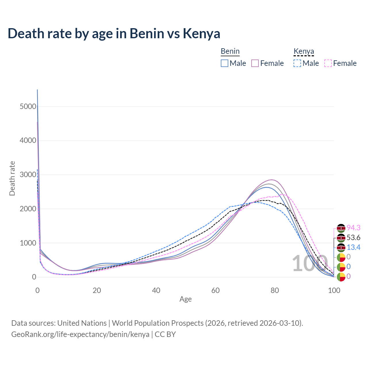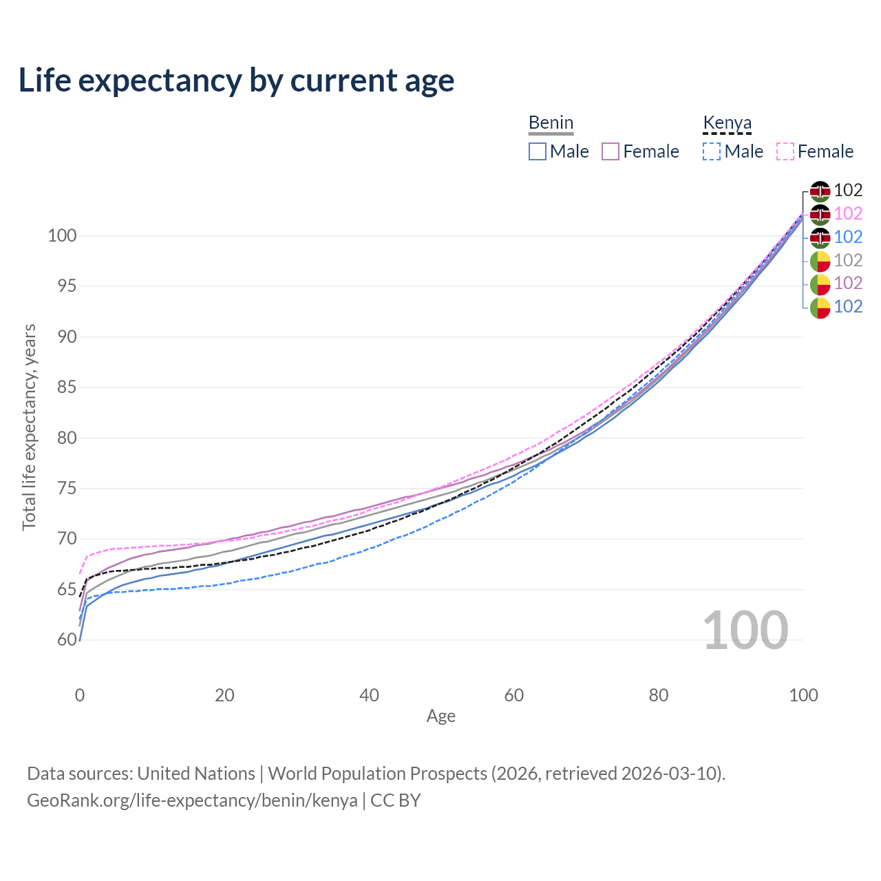 This life expectancy calculator shows the odds of living to 100, 95, 90, and below based on current age for both males and females in Benin and Kenya, along with mean and median age of death. The calculations are based on the 2026 life tables (actuarial tables) from the UN World Population Prospects.