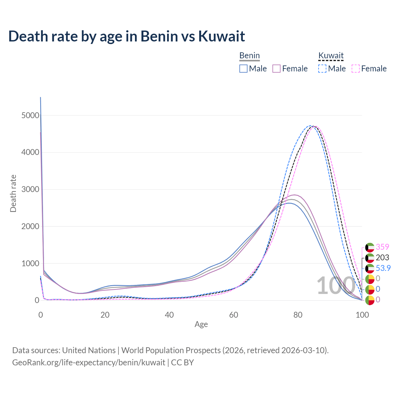 In Benin, the most common age of death is 0, compared to 85 in Kuwait. The median age of death is 70.1 in Benin and 83.3 in Kuwait, meaning only half of each cohort is expected to live past that age.