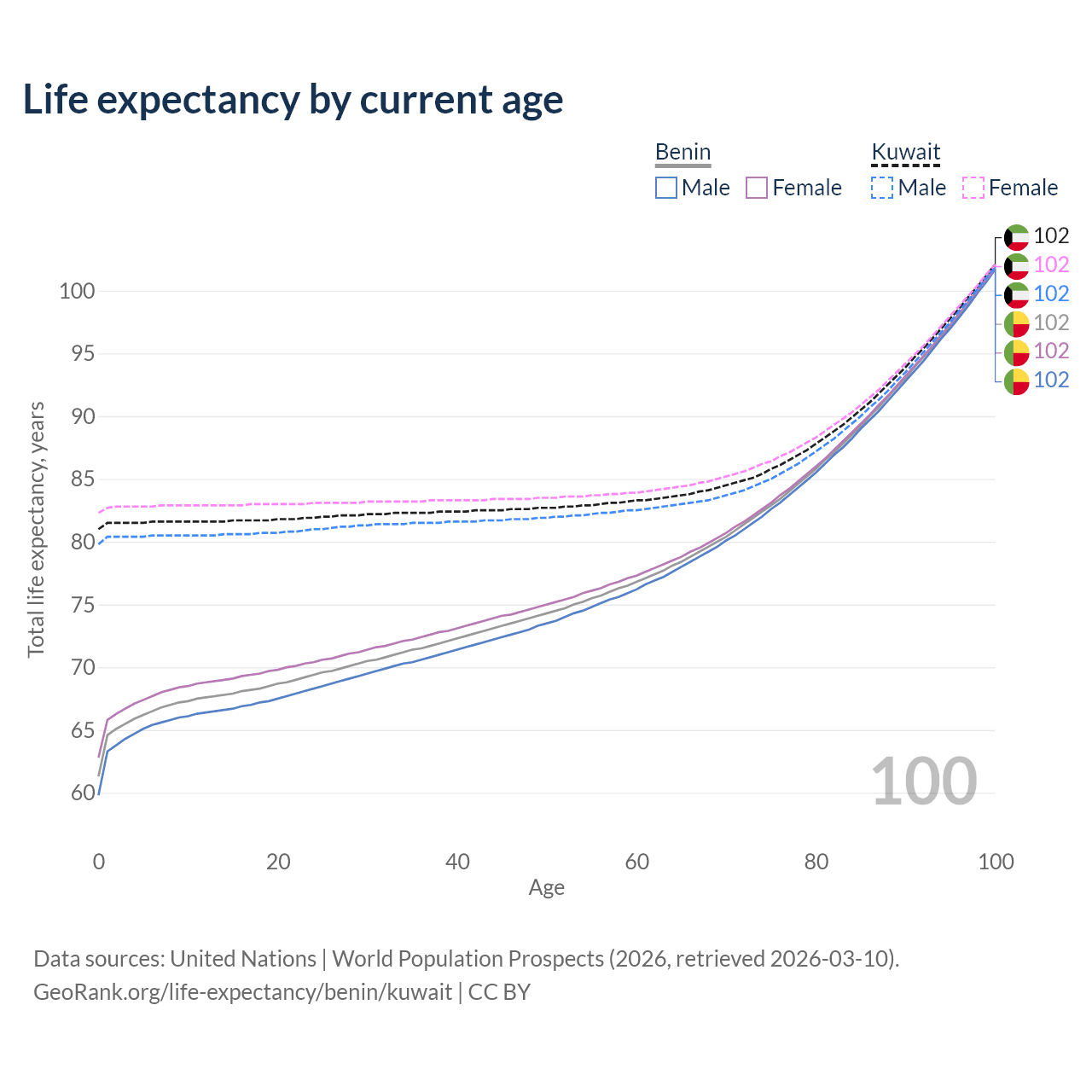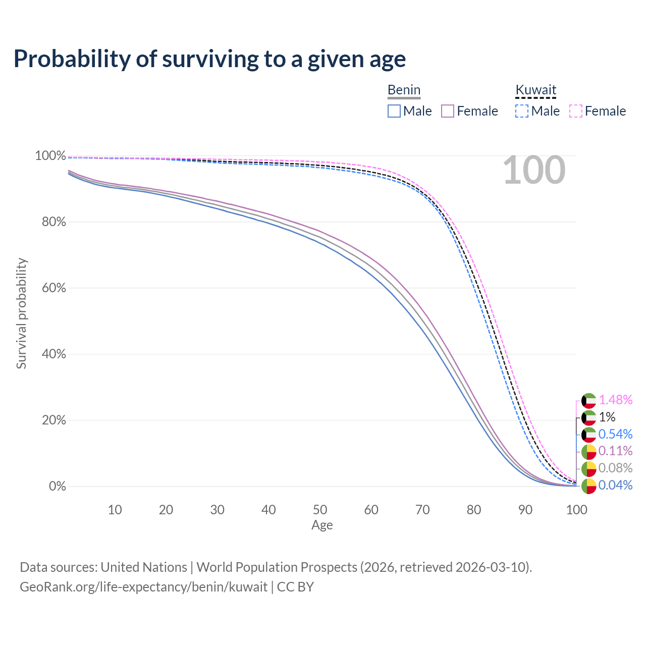 This life expectancy calculator shows the odds of living to 100, 95, 90, and below based on current age for both males and females in Benin and Kuwait, along with mean and median age of death. The calculations are based on the 2026 life tables (actuarial tables) from the UN World Population Prospects.