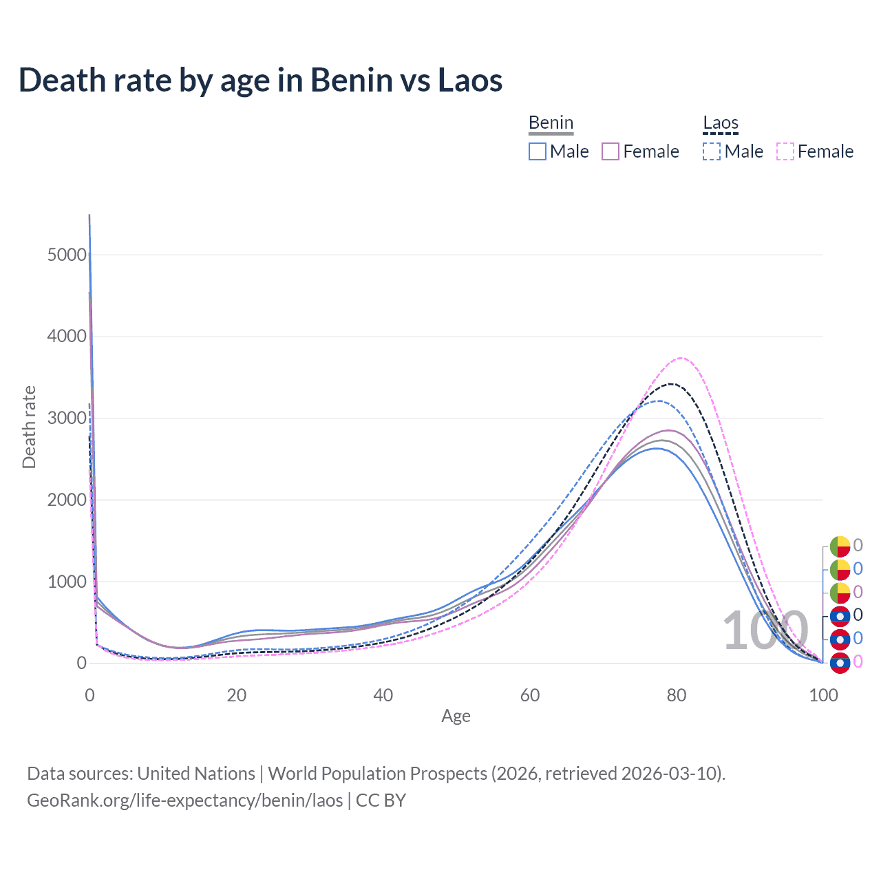 In Benin, the most common age of death is 0, compared to 79 in Laos. The median age of death is 70.1 in Benin and 74.7 in Laos, meaning only half of each cohort is expected to live past that age.
