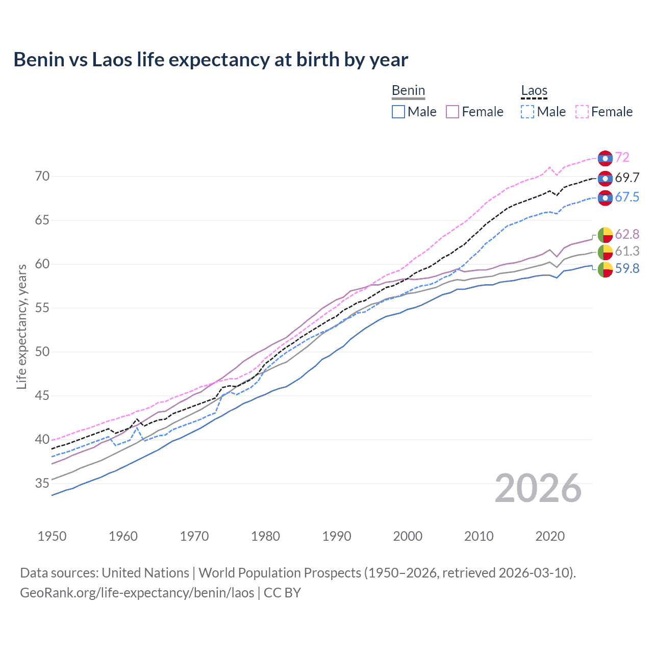 The average life expectancy at birth is 61.3 years in Benin vs 69.7 in Laos. Benin is ranked 189/197 by life expectancy, and Laos is 139/197. In Benin, the life expectancy is 59.8 years for males and 62.8 years for females. In Laos, it's 67.5 years for males and 72 years for females.
