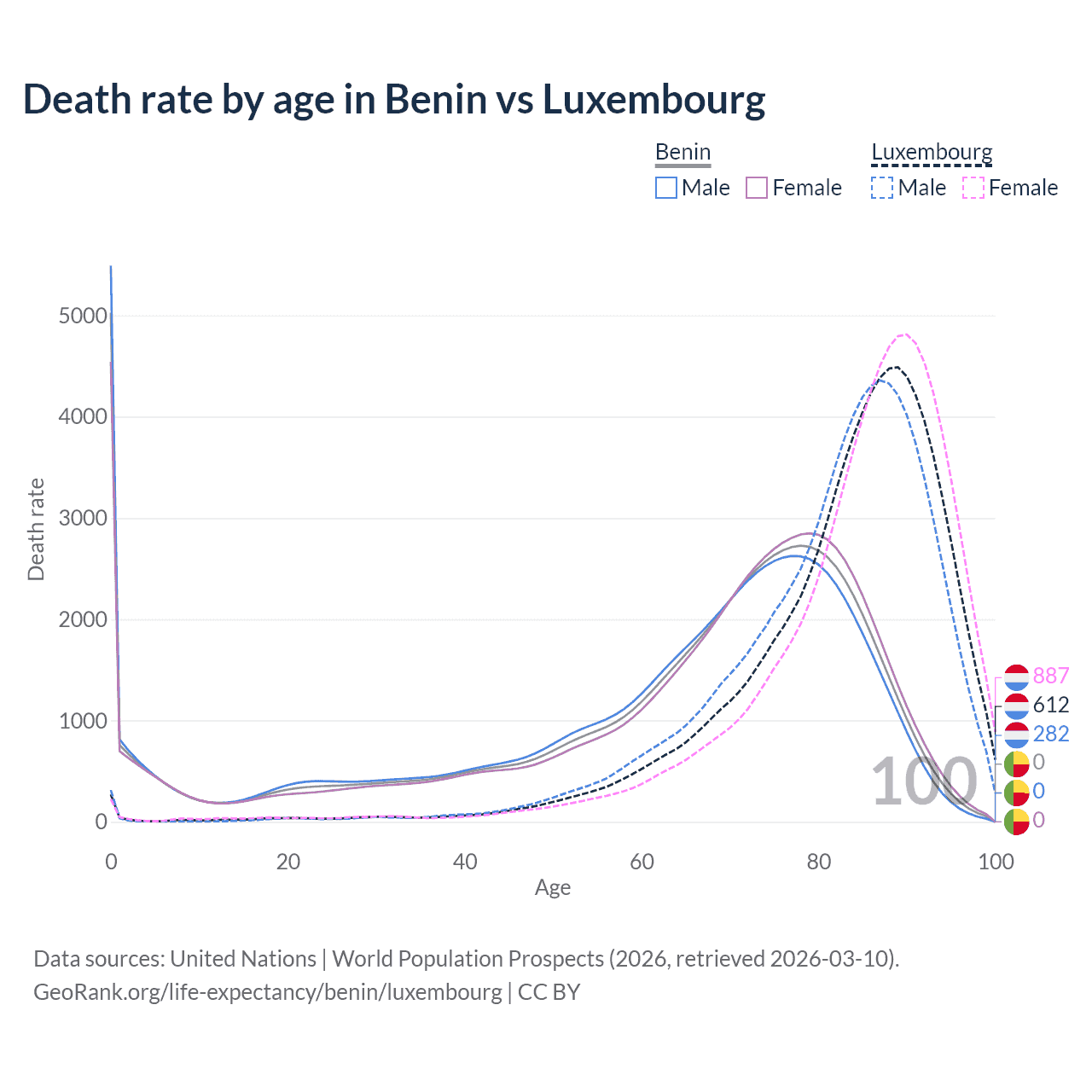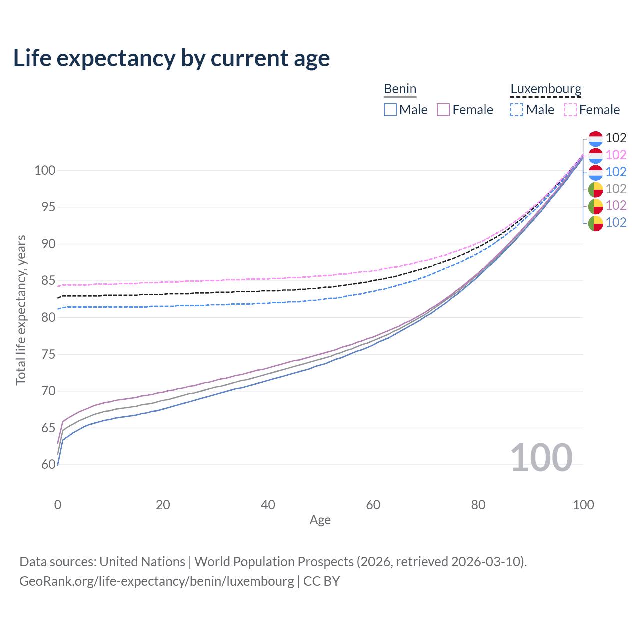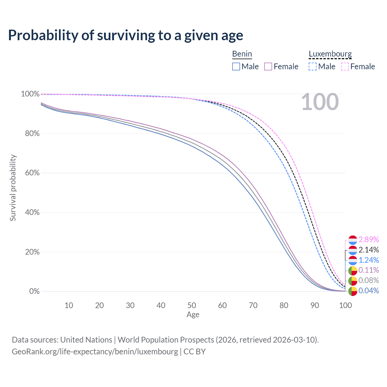 This life expectancy calculator shows the odds of living to 100, 95, 90, and below based on current age for both males and females in Benin and Luxembourg, along with mean and median age of death. The calculations are based on the 2026 life tables (actuarial tables) from the UN World Population Prospects.